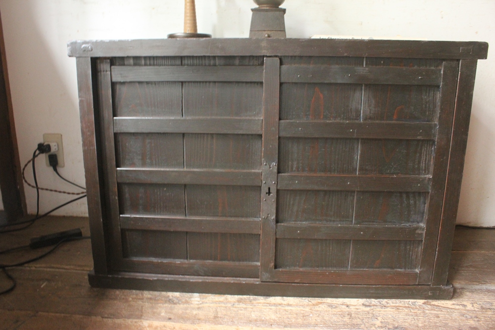 杉の木戸水屋です。黒に近い茶色でとても渋いです。江戸の嘉永のモノでカッコいいです。和室やお玄関などに置いても場がしまります。モダンなインテリアにも似合います。さりげないテレビボードにも良さそうです。目立たないように配線穴も開けることが出来ますのでご相談ください。