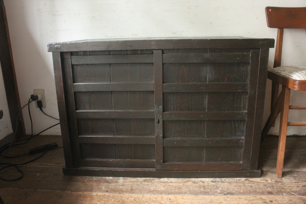 檜のローボードです。ヒノキはキメの細かい杢目ですが、とても渋いです。背が高すぎず、低すぎず圧迫感がありません。和室に置いても場がしまります。さりげないテレビボードにもよいです。和にもモダンにも使えます。中が見えないので、道具類や本、何でも収納できます。明治頃の仕事でとてもカッコいいとおもいます。