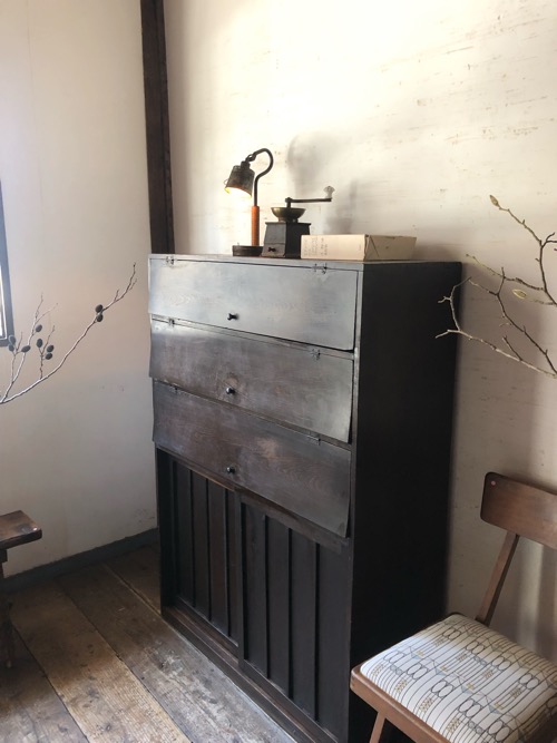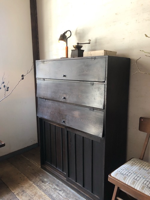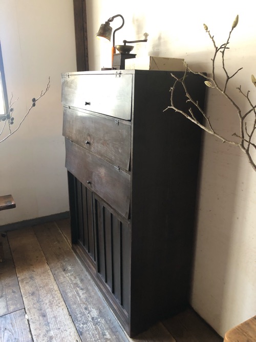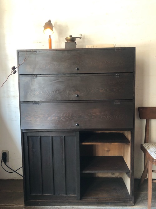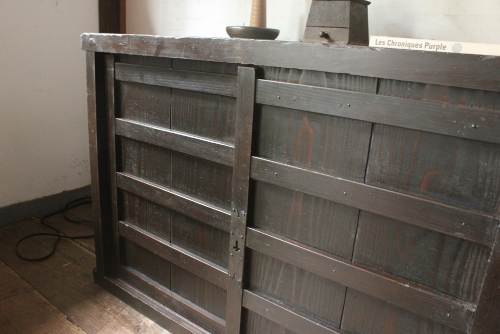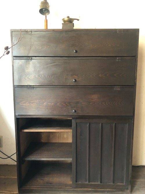 杉の収納棚です。明治頃のもので、とても味がある木です。何に使っていたんでしょうか?初めて見ます。扉の作りが変わっています。横幅が狭く、背が高く。深めの引き出しもついてちゃんと収納力もあります。見ているだけで楽しく幸せな気持ちになります。何、いれましょうね。