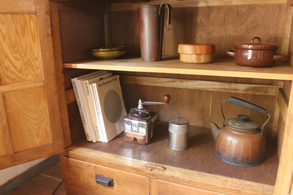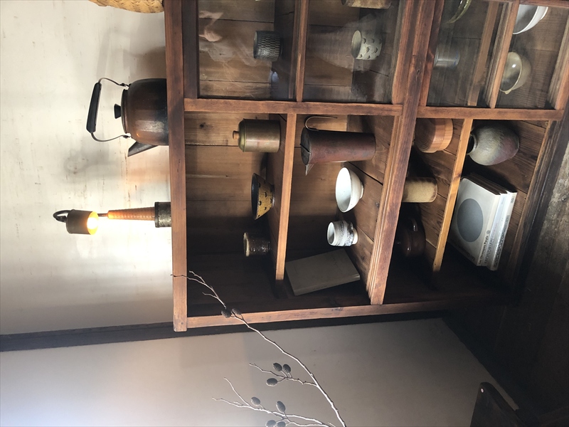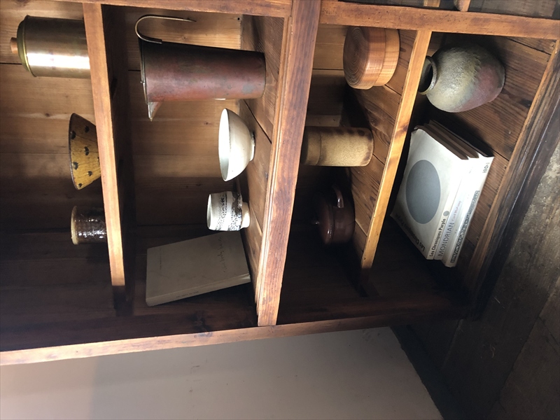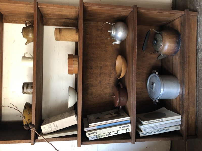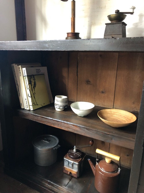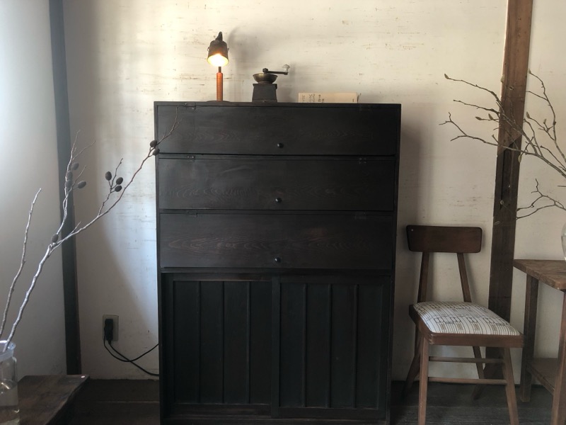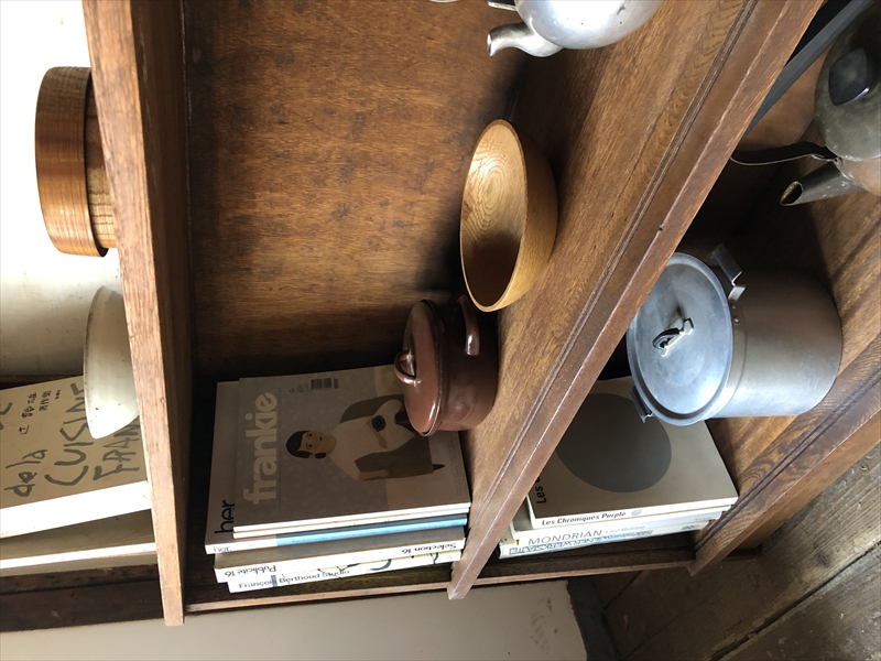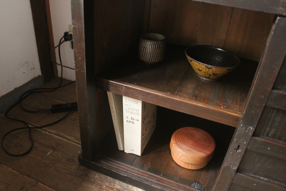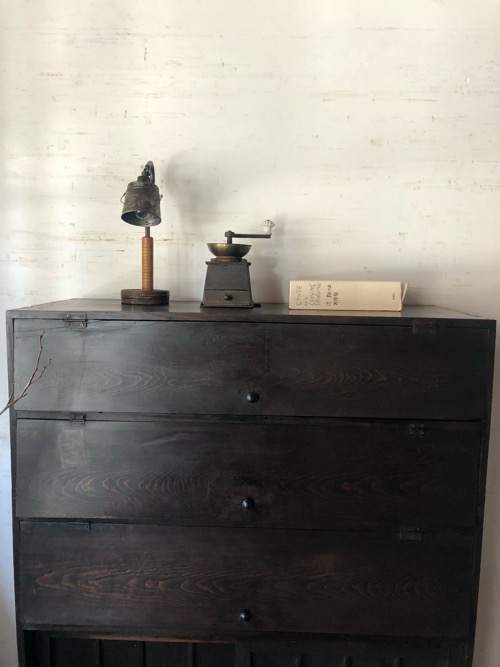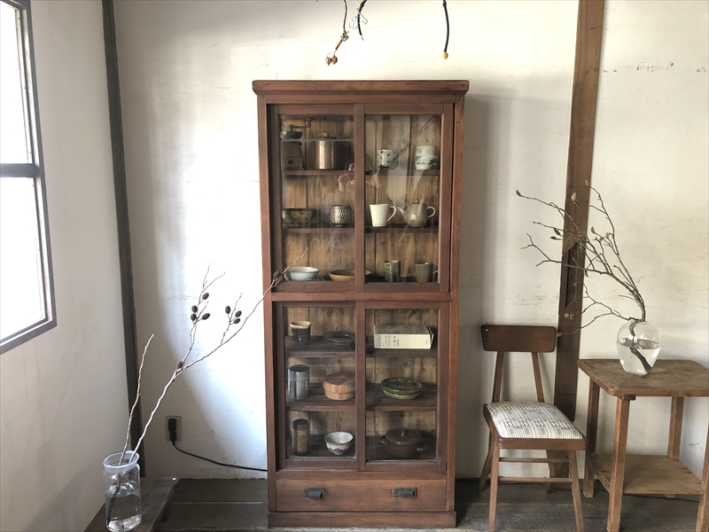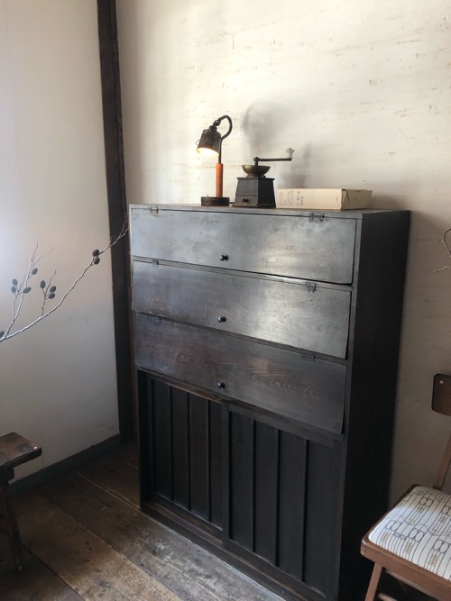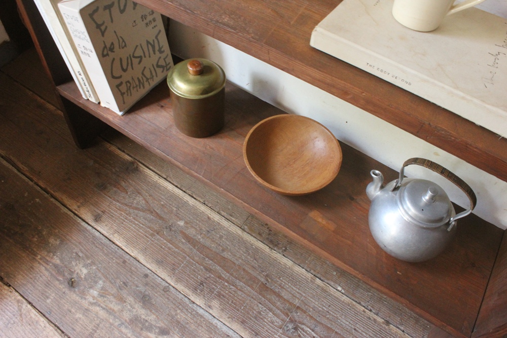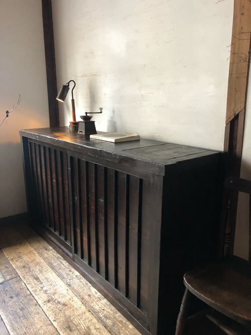 松の木の水屋です。とても渋い色です。民芸ですが、ここまできれいだとどこか外国のものにも見えてきます。むちゃくちゃ和にしたり、いっそ違う素材や国のものと合わせたり、思った以上にすっきりまとまります。サイズも適当で、お家で使いやすいです。収納力も高いです。