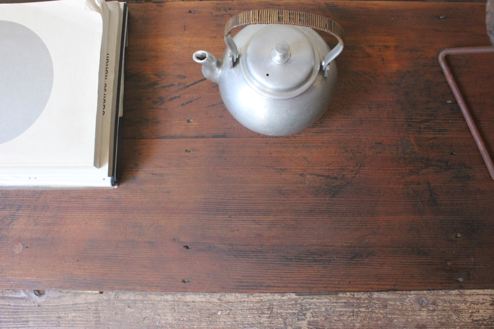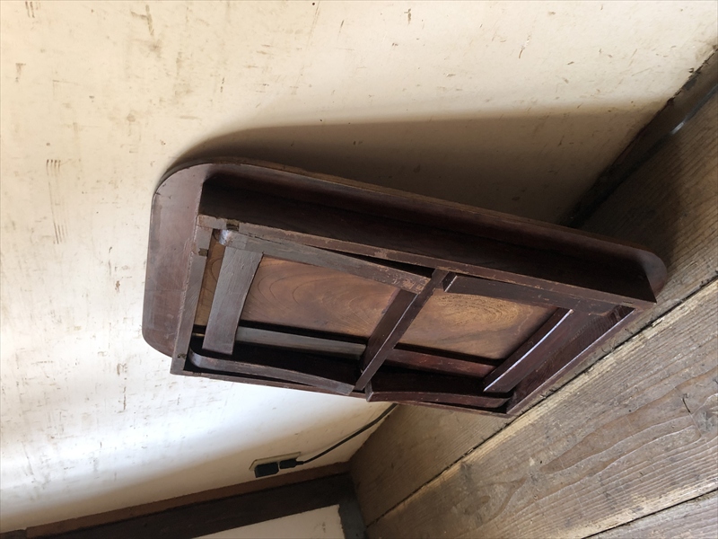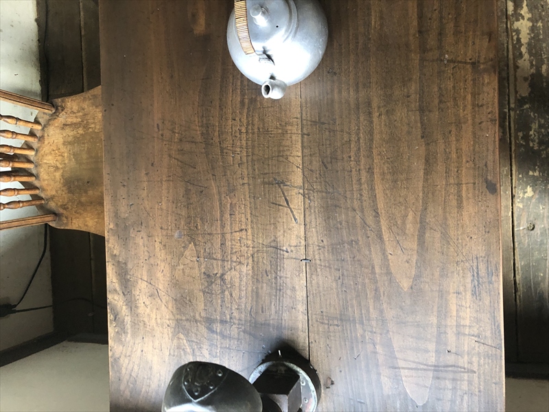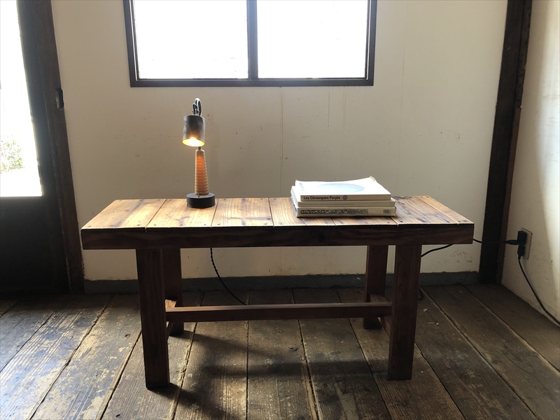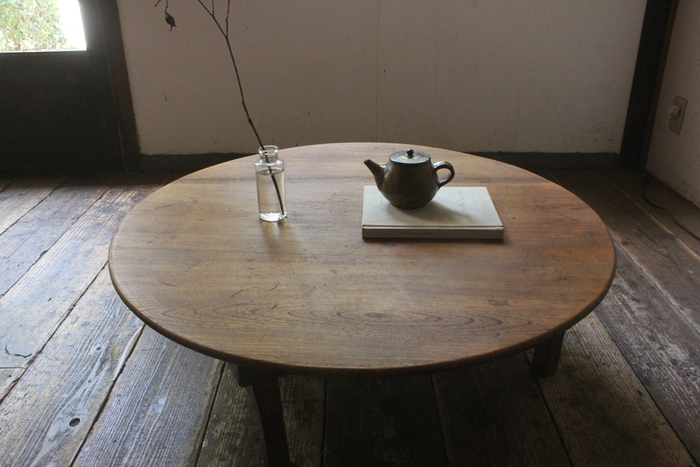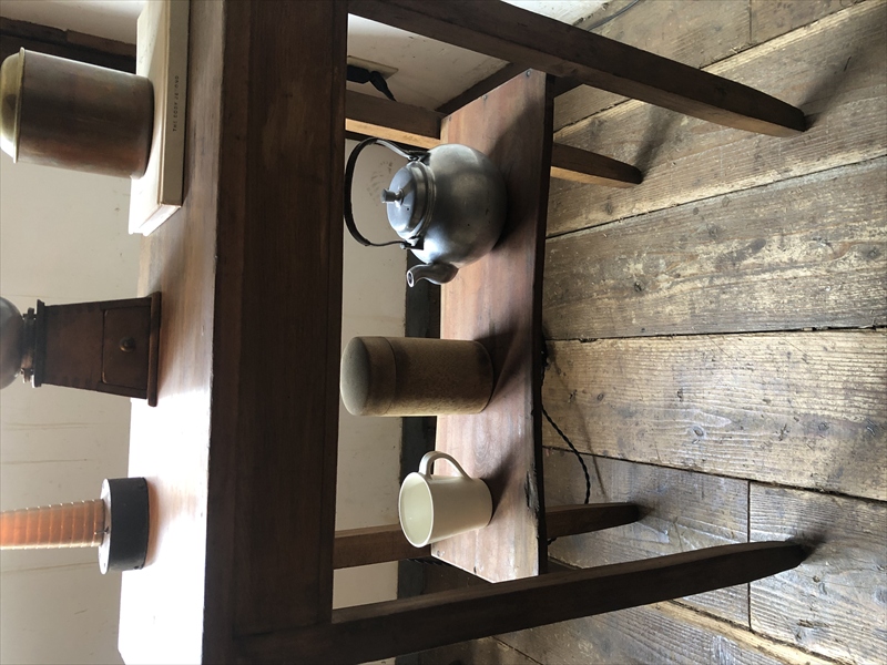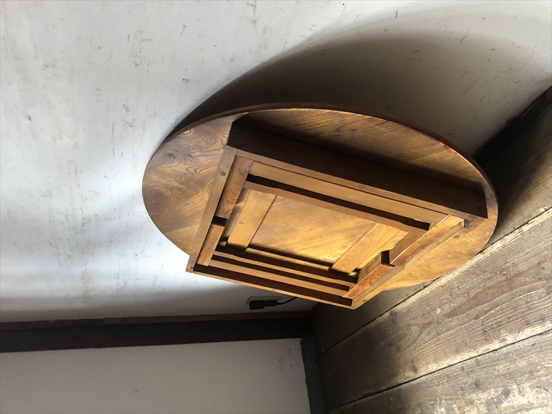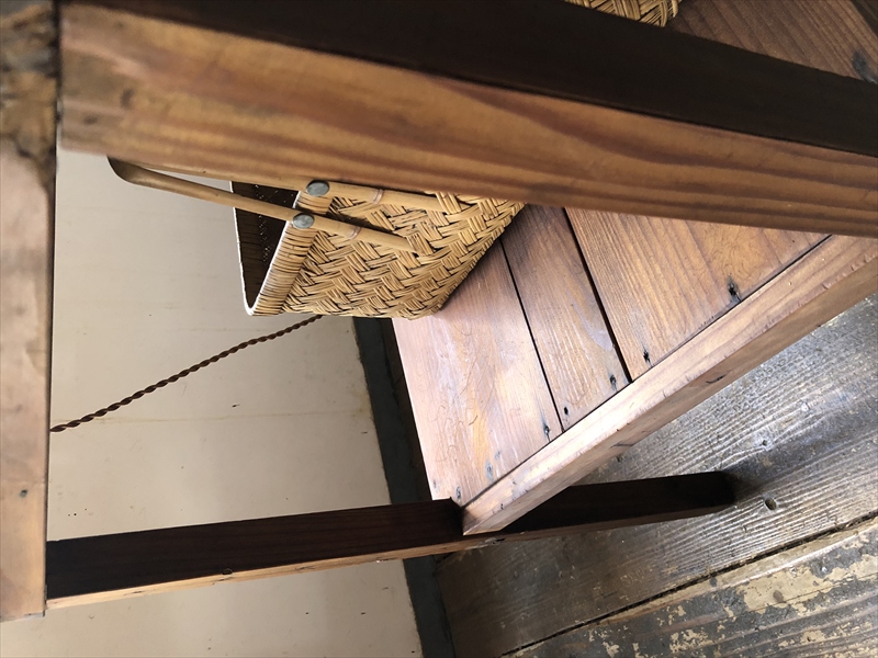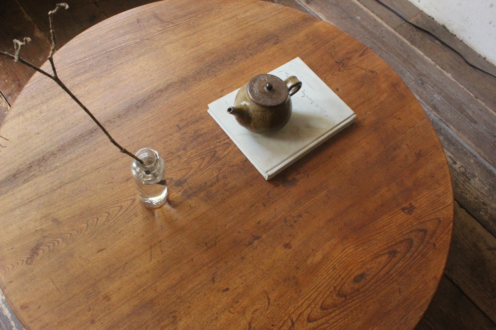 栗と松のテーブルです。天板が栗の木で脚などは松の木です。素朴で良い佇まいです。引き出しがついているので、脚が入るような入らないような感じです。メインのテーブルよりは、お茶をのんだり、ご飯を食べたあとに、お酒をのんだり、休憩に使ったり、そんな使い方が楽しそうです。4人くらいでゆったり囲める大きさです。