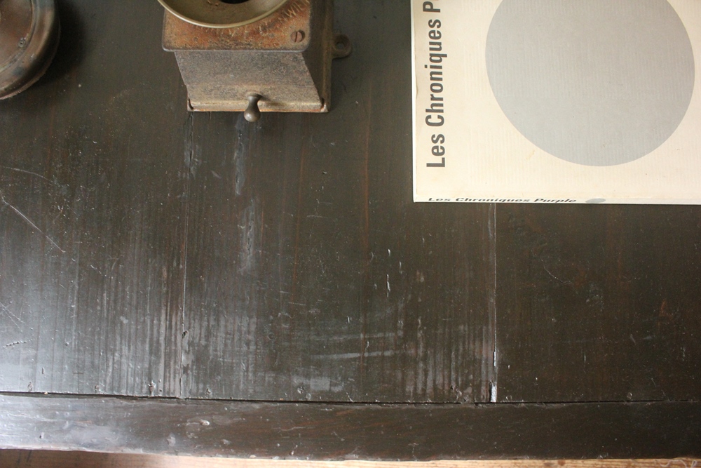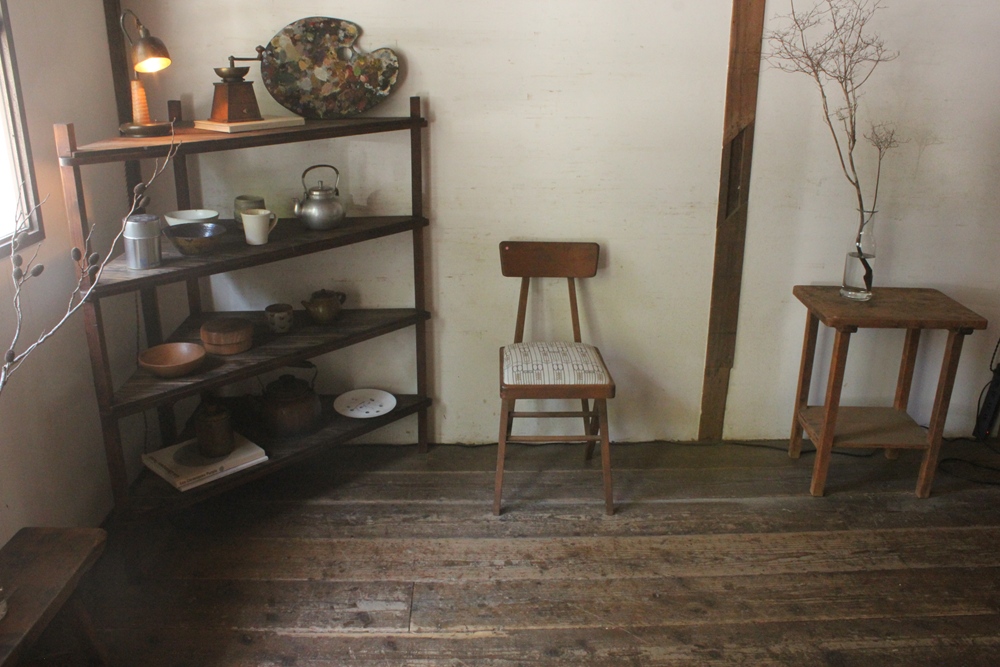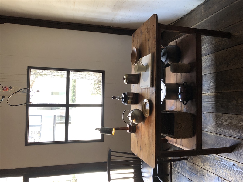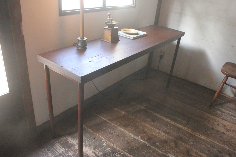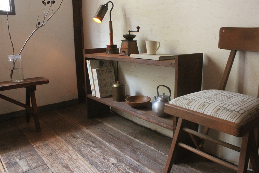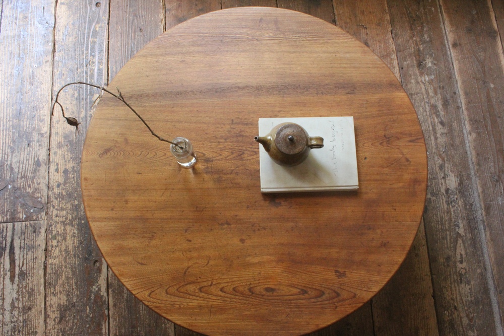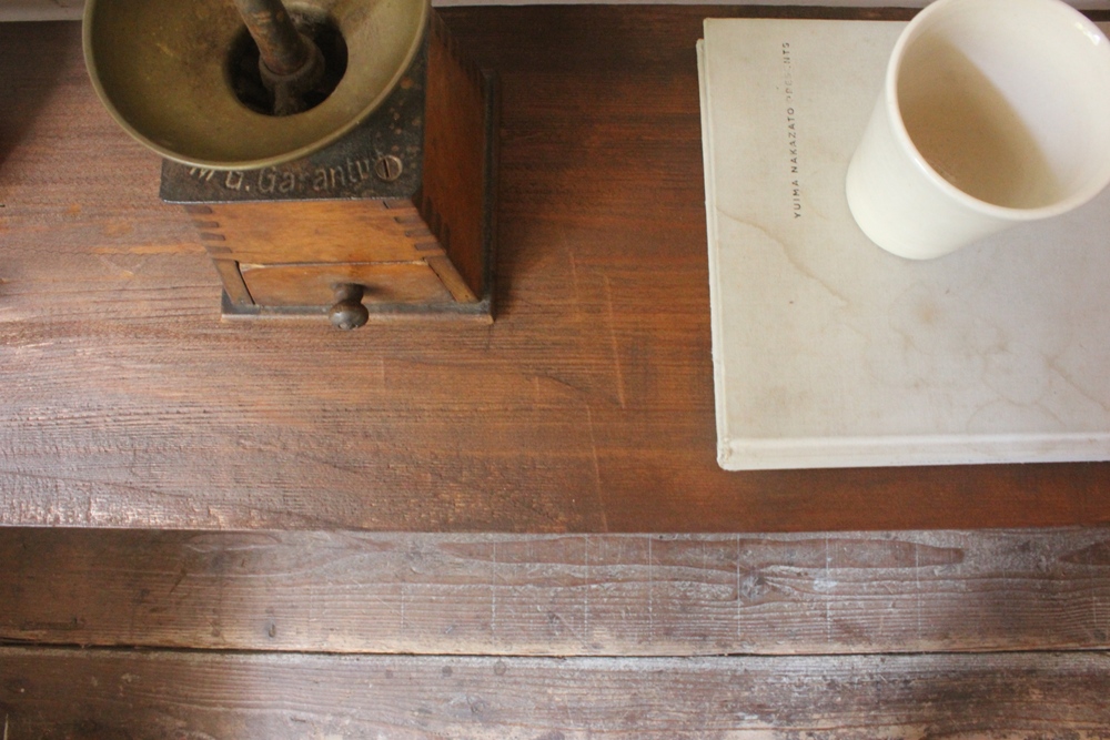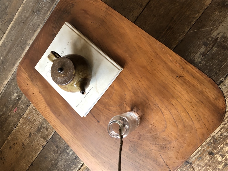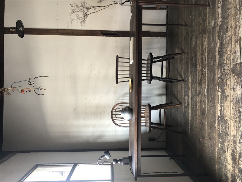 栗と松のテーブルです。天板が栗の木で脚などは松の木です。素朴で良い佇まいです。引き出しがついているので、脚が入るような入らないような感じです。メインのテーブルよりは、お茶をのんだり、ご飯を食べたあとに、お酒をのんだり、休憩に使ったり、そんな使い方が楽しそうです。4人くらいでゆったり囲める大きさです。