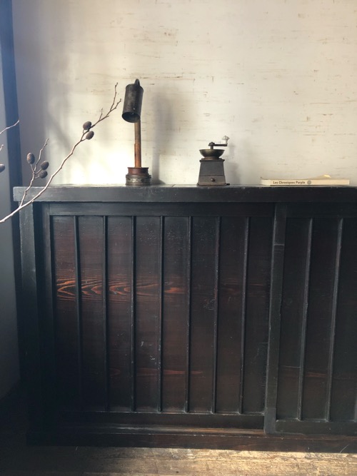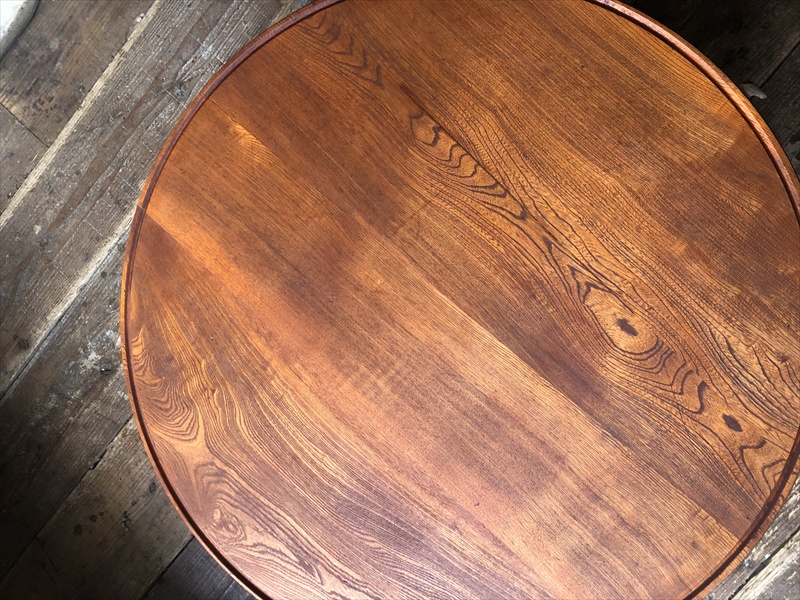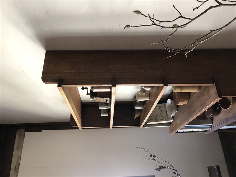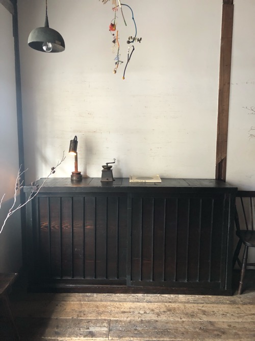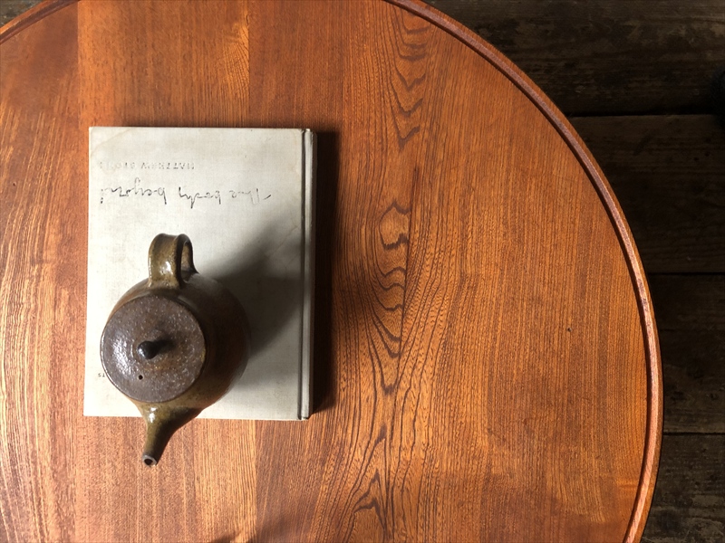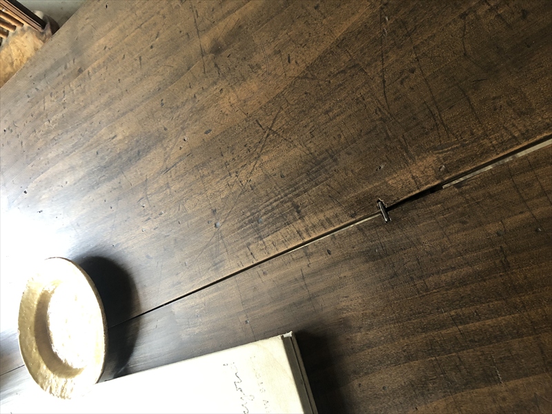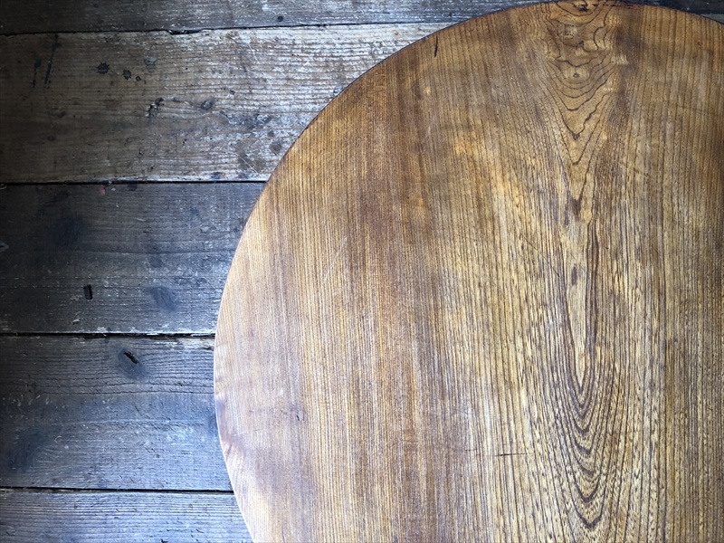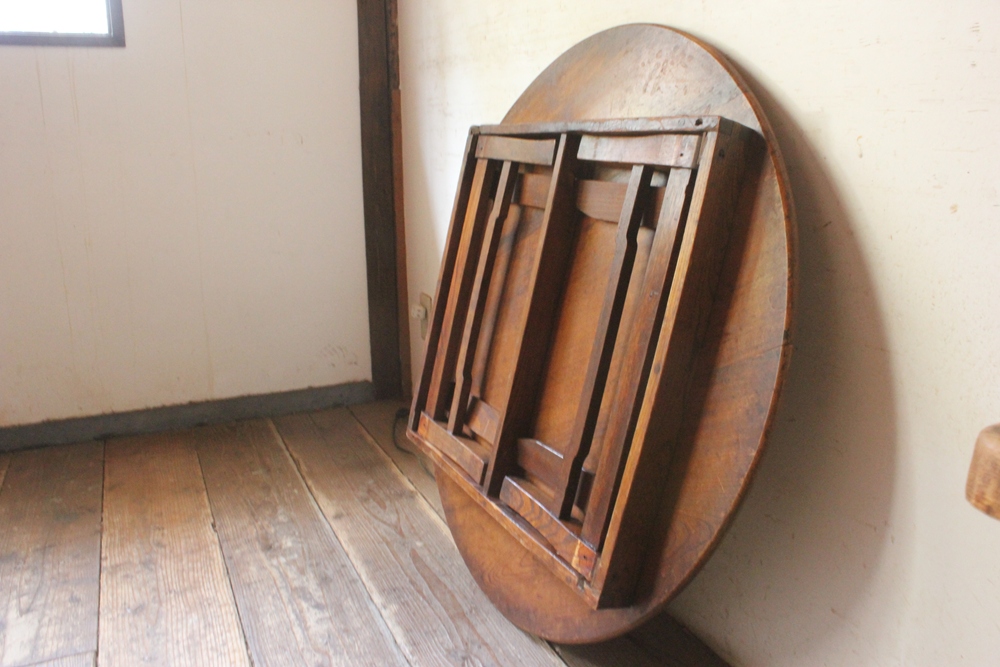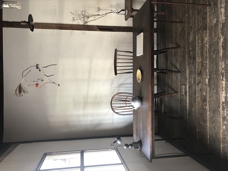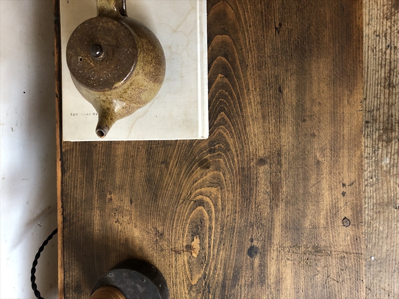 栗と松のテーブルです。天板が栗の木で脚などは松の木です。素朴で良い佇まいです。引き出しがついているので、脚が入るような入らないような感じです。メインのテーブルよりは、お茶をのんだり、ご飯を食べたあとに、お酒をのんだり、休憩に使ったり、そんな使い方が楽しそうです。4人くらいでゆったり囲める大きさです。