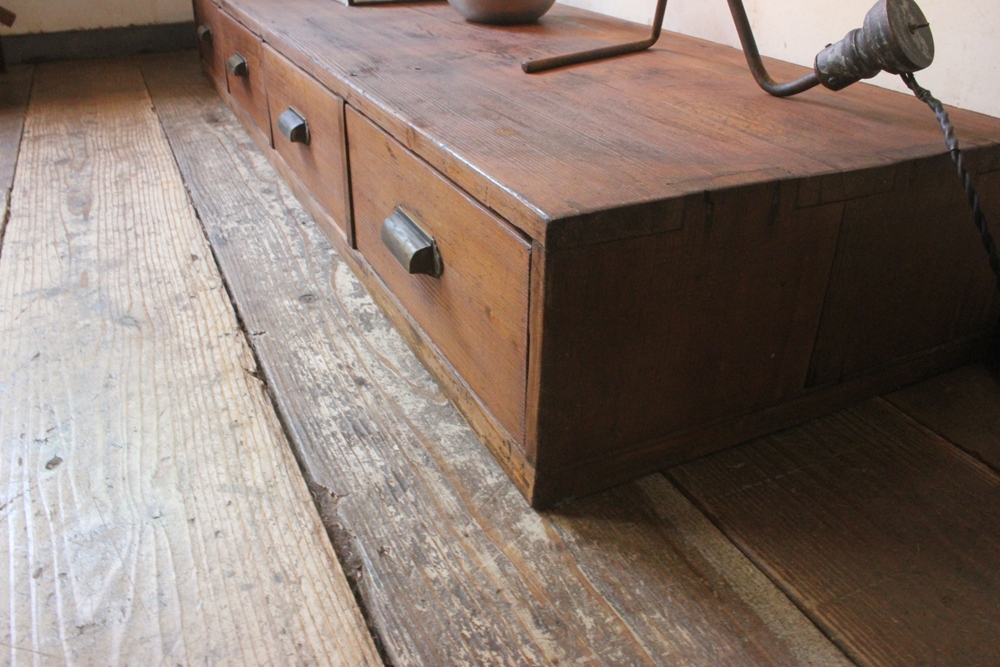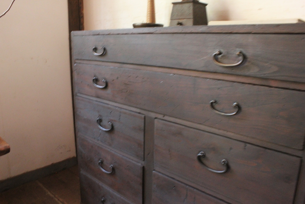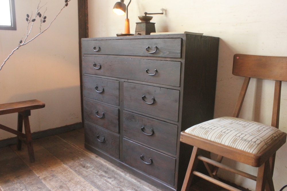 松のチェストです。黒に近い茶色で渋いです。松なので余計に渋いです。幕末明治のモノですが、奥行が狭くシュッとしています。圧迫感なく置けます。洋服などちゃんと収納しながら、場がしまります。