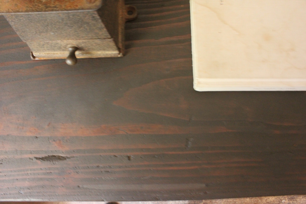 杉のテーブルです。素朴な杉で良い佇まいです。引き出しは片方だけに付いています。奥行が狭めで圧迫感なく使えます。作業台にしたり、6人くらいのご飯にも良いサイズです。角の金具も可愛らしく、キュートです。