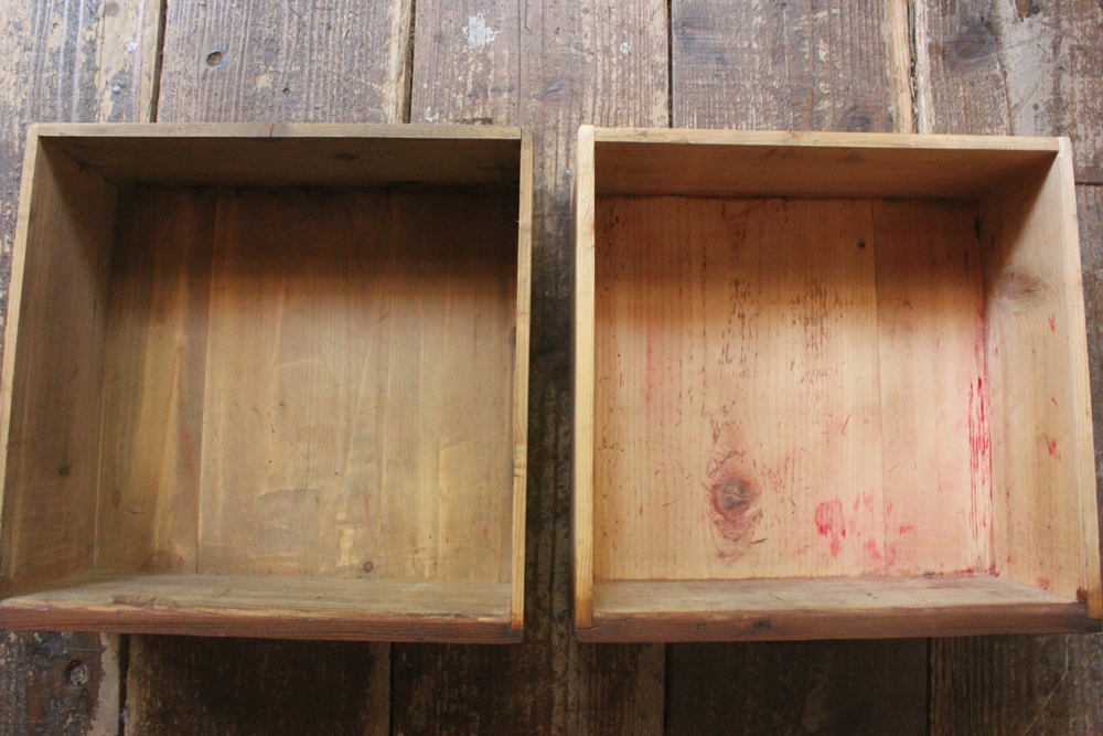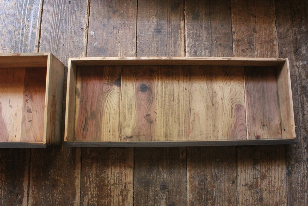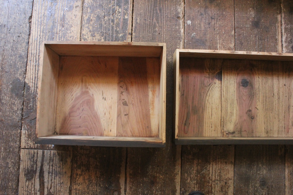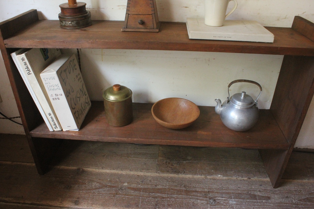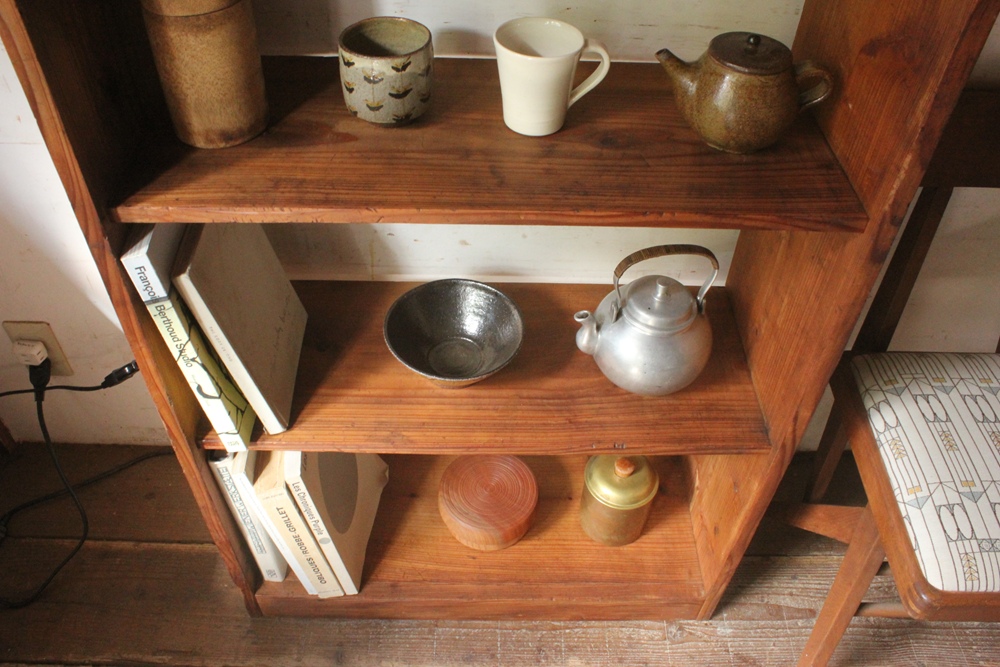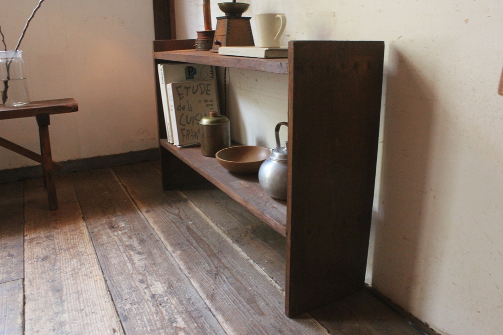 松の木の棚です。松独特の少し油を含んだような、しずかでカッコいい杢目です。棚板も分厚く、横から見てもとてもキレイです。元々、和菓子屋さんでお餅などを並べていたような棚です。そのせいか力強いですが品があります。お店で什器に使うのはもちろん良いし、お家でも手におえる大きさです。壁に付けても間仕切りでもどちらでも。飾ったり、商品並べたり、洋服の収納に使ったり、道具類を置いたり、色々楽しめます。