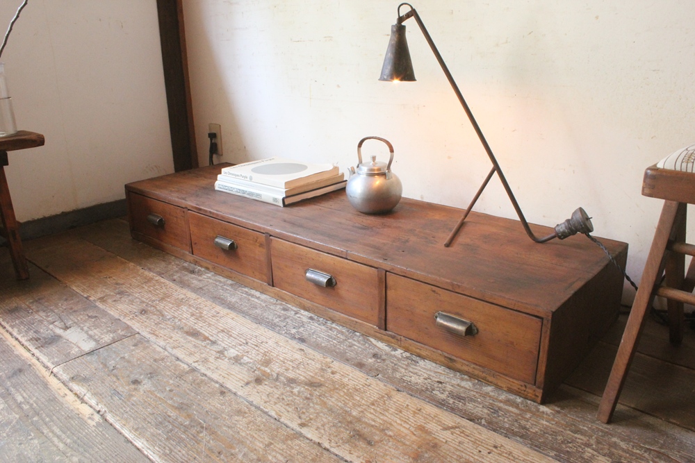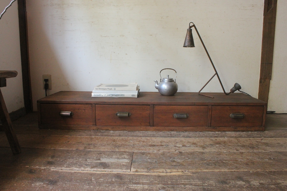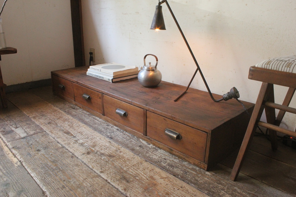 檜のローボードです。明治のものでとても美しくモダンでもあります。数寄屋造りのような和の空間にも合いますし、コンクリート張りのシュッとした空間でも合います。明治のデザインってすごいですね。テレビ台にしてもいいですが、お玄関の正面などに置いたりしても場がしまります。棚板を付けてままでもA4サイズも入りますが、左右それぞれ棚板が外せますので色んな収納にも向いています。高さもすこし低めなのでそこも良いですね。
