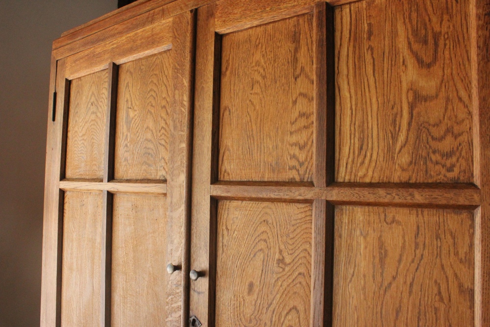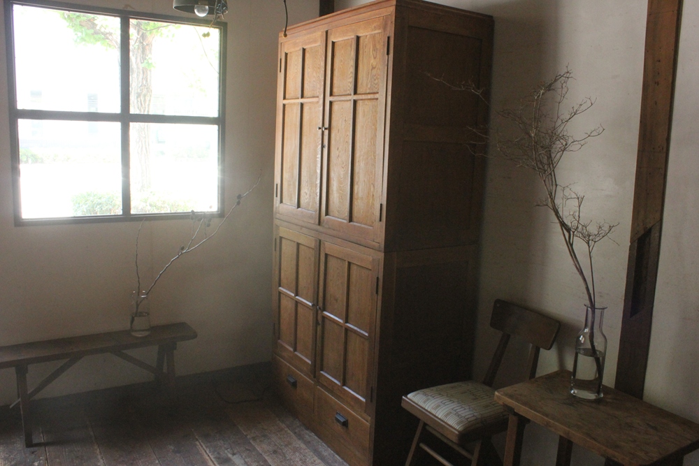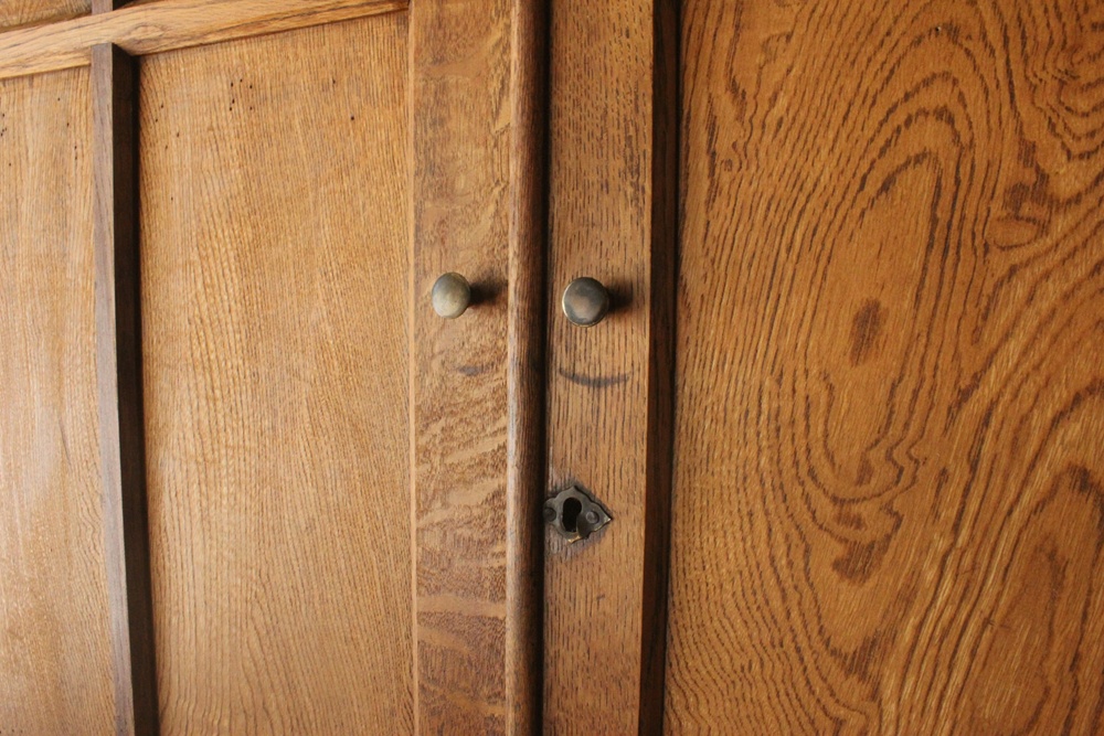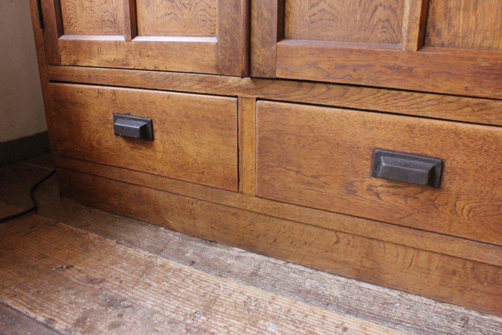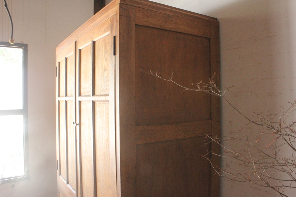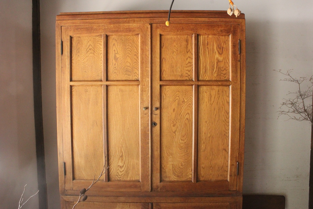楢のキャビネットです。ナラ独特の美しい杢目です。日本らしくないデザインで修道院で使っていそうな佇まいです。美しく、カッコいいです。洋服たんすにしたり、器や本やとにかく片付けたいもの入れるのにいいです。見える所に置いて、お部屋の顔になる家具ですよ。お店にもいいかな。