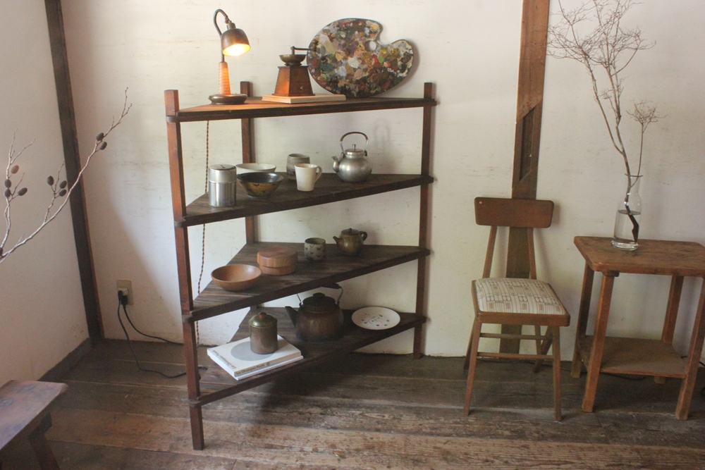 杉の三角棚です。かろやかな杉の杢目です。とても珍しい形の棚で私も初めて扱います。隅に置いても、空間の途中に置いてもカッコいいです。アートなど置くにも良さそうな雰囲気です。器や本やオブジェや絵やなんでもサマになりますよ。正直、店主が欲しいわー。