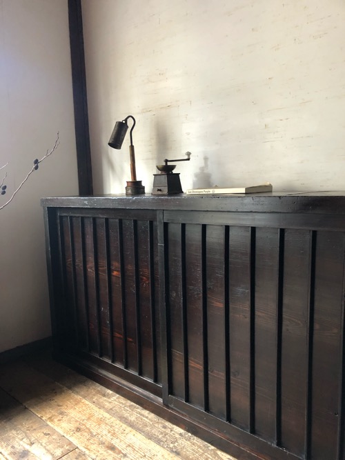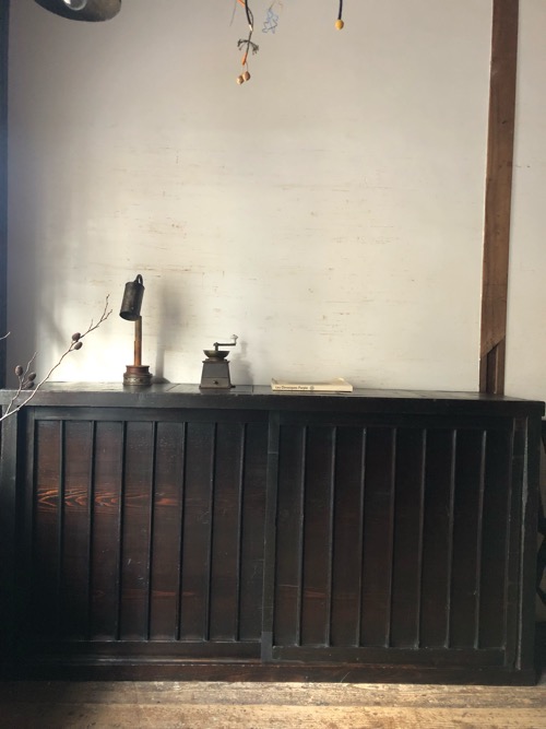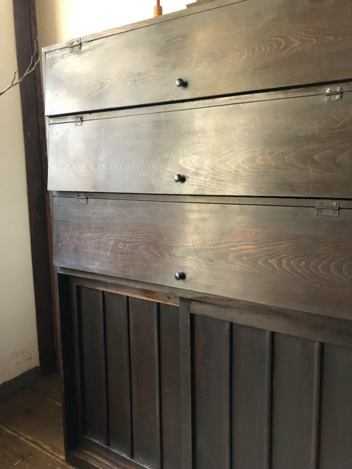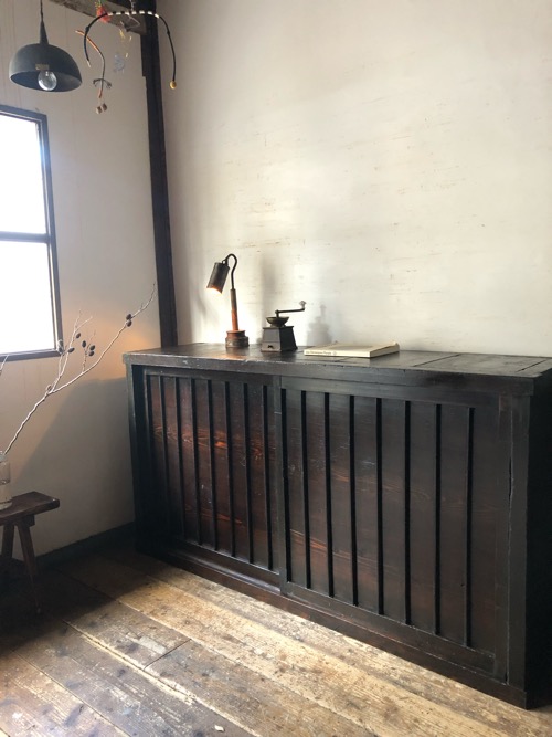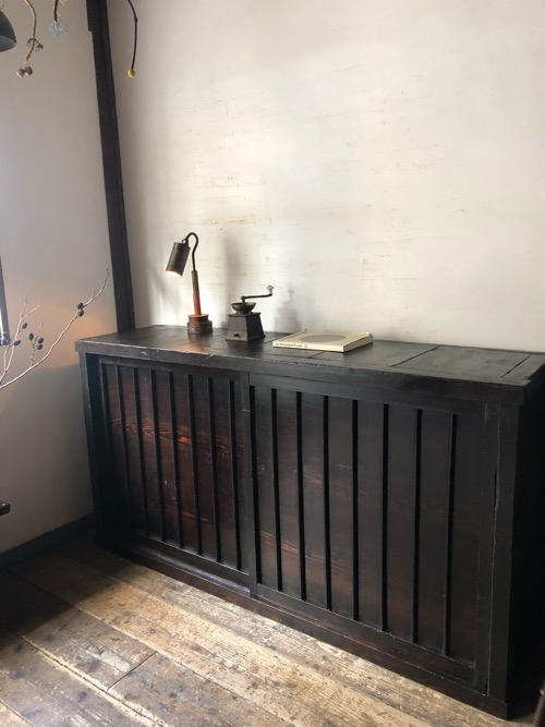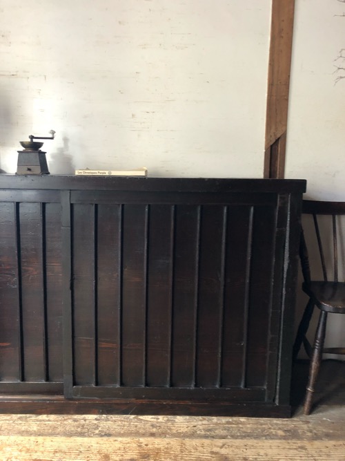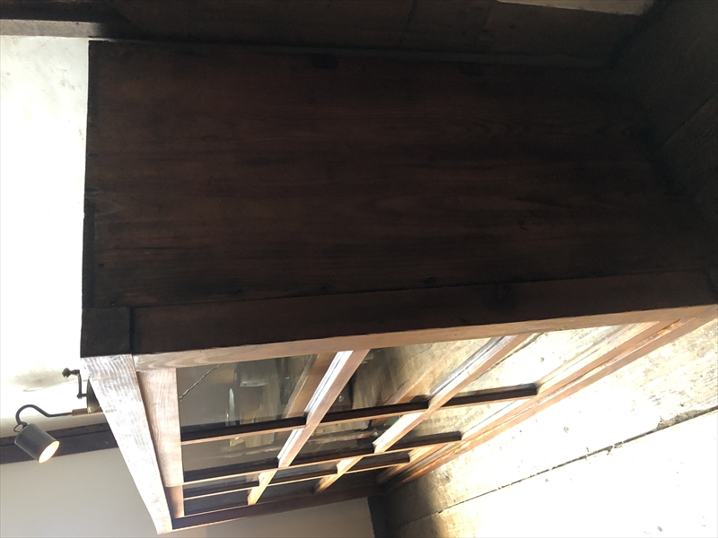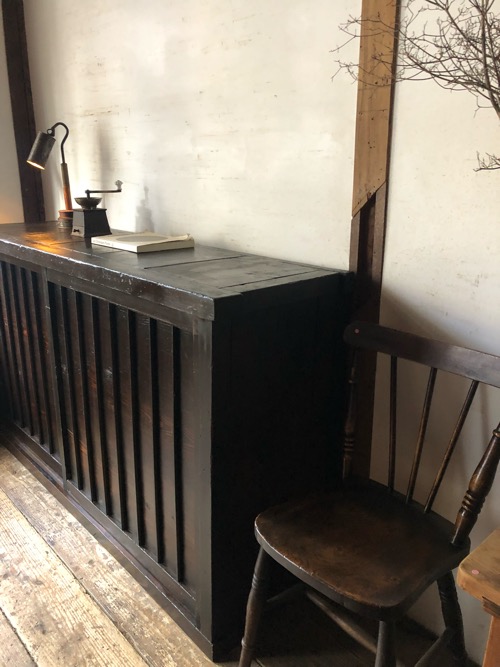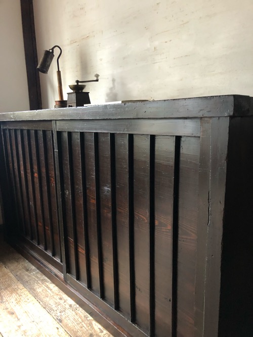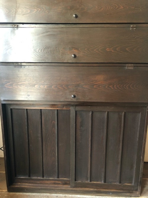 杉の木戸水屋です。渋い色目です。黒茶です。明治のモノですが、渋くもあり、モダンにも見えます。超、和の空間にもシュッとした空間でも場が締まります。壁に付けても、間仕切りにしてカウンタ―っぽくも使えます。収納力もありますので頼りにもなりますね。