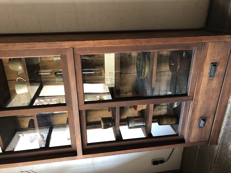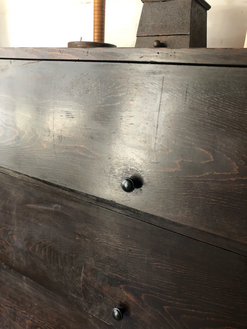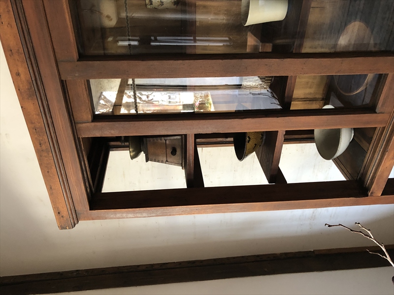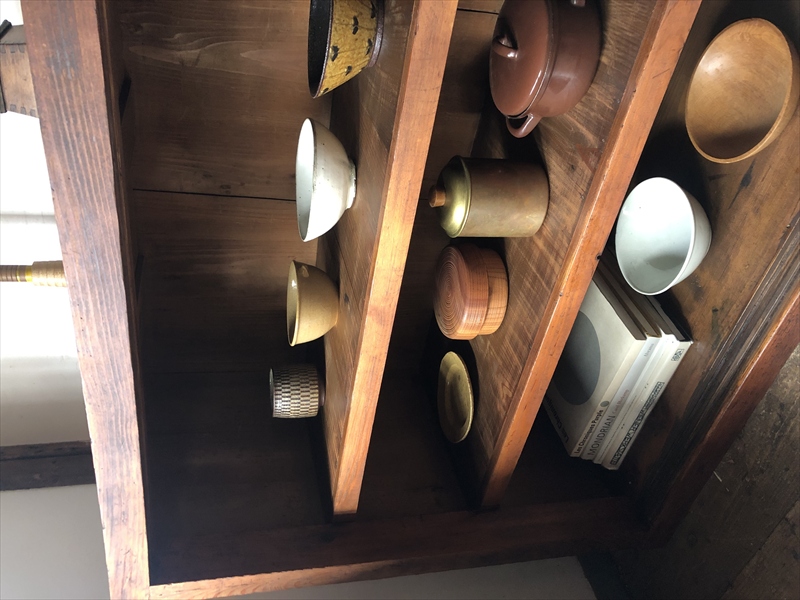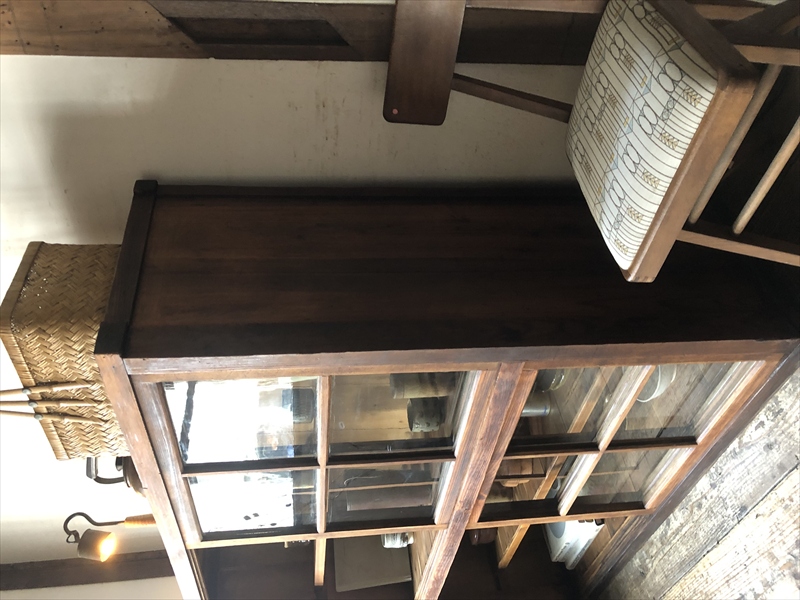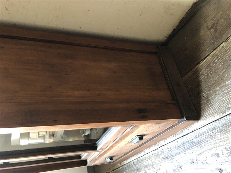 欅と杉のキャビネットです。前がケヤキ材でとても品のいいきれいな杢目です。片扉や細部の意匠までとても美しくなんとも言えません。明治から大正の和洋折衷なモダンであり、日本らしいデザインでもあり、どこで使われていたんでしょうね?お家だと、いっそ洋服などの収納などでも気軽に使ってもいいのでは。意外とすんなり収まる大きさです。