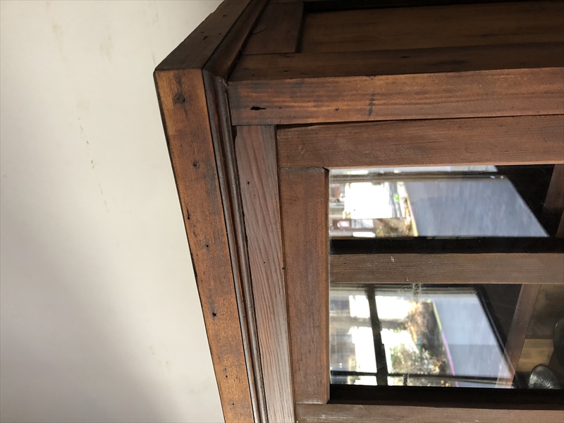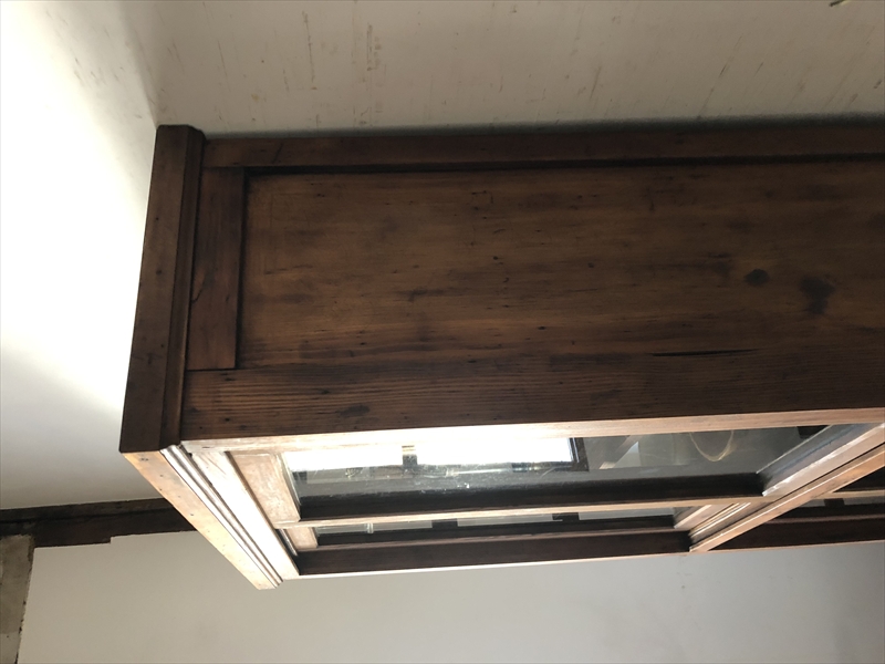 松と檜と杉の水屋です。枠が松、戸がヒノキです。とても渋くいい色です。明治の薬局で使われていました。細部まで意匠がきれいです。大きいですが奥行が狭めですっきり美しいです。民藝にもモダンにも見えます。町屋などの古いお家からシュッとした空間や洋の佇まいのお家からスッとおさまります。いいモノは寛容ですね。棚板は右下段が1枚外せますので本や背の高いものの収納も出来ます。