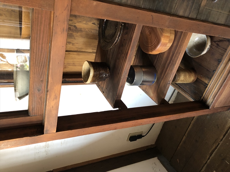 欅と楓と松の水屋です。扉の部分はケヤキ、枠がカエデです。とてもキレイな木目です。とてもしっかりした作りで、棚板も沢山ついています。なんとも楽しくて、うつくしい水屋です。