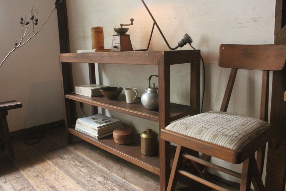 上の段はA4サイズも入ります。本棚にしたり、お茶まわりのものを置いたり、台所で使っても良さそうです。李朝のような静けさ、民芸のあたたかみがありますよ。松と栗の木のとてもいい雰囲気です。