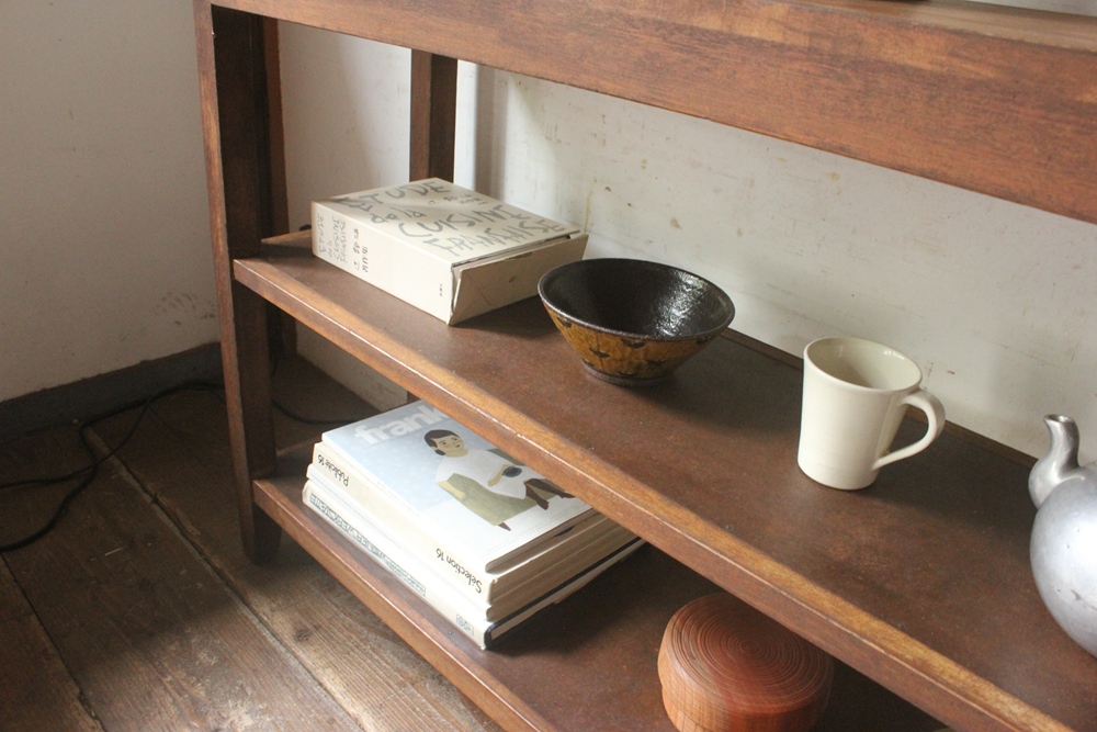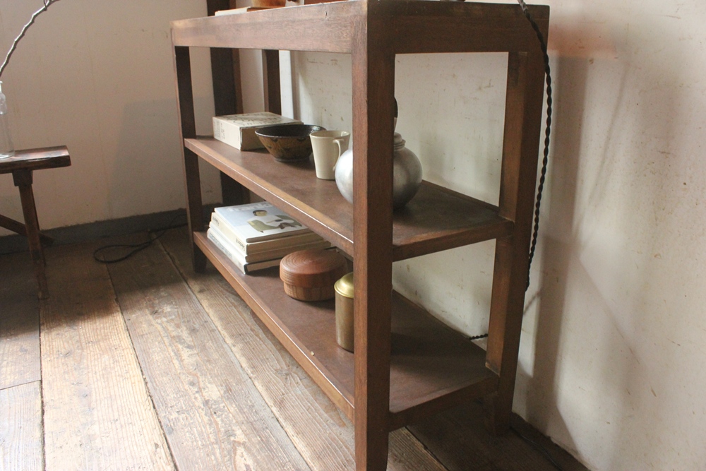 たぶんと栃の木の棚です。とても硬い木でずっしり味があります。台所に置いて、お茶まわりのものや、カゴ、缶類、瓶など置いたり、やはり本棚にも向いています。奥行きが狭いので壁さえ空いていれば廊下にも置けるサイズです。