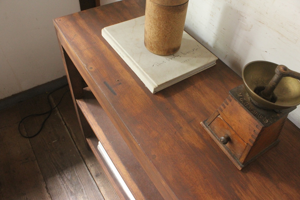 ラワンの棚です。分厚いラワンで素朴でいい味です。背板も味のいい杉の木です。脚付きで珍しいです。壁に付けても、間仕切りにしてカウンターっぽくも使えます。上で軽作業も出来ますし、お店のレジカウンターにもなりますよ。扉がない食器棚にもいいですね。天板もしっかりしてますので家電を置いても大丈夫です。