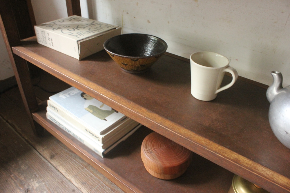 杉の棚です。燻された黒に近い茶色で良い味です。渋めの器などにも似合います。器や本やいろいろ収納できます。背板がカッコいいので間仕切りにしてもいいですね。有りそうで無いかんじの棚です。