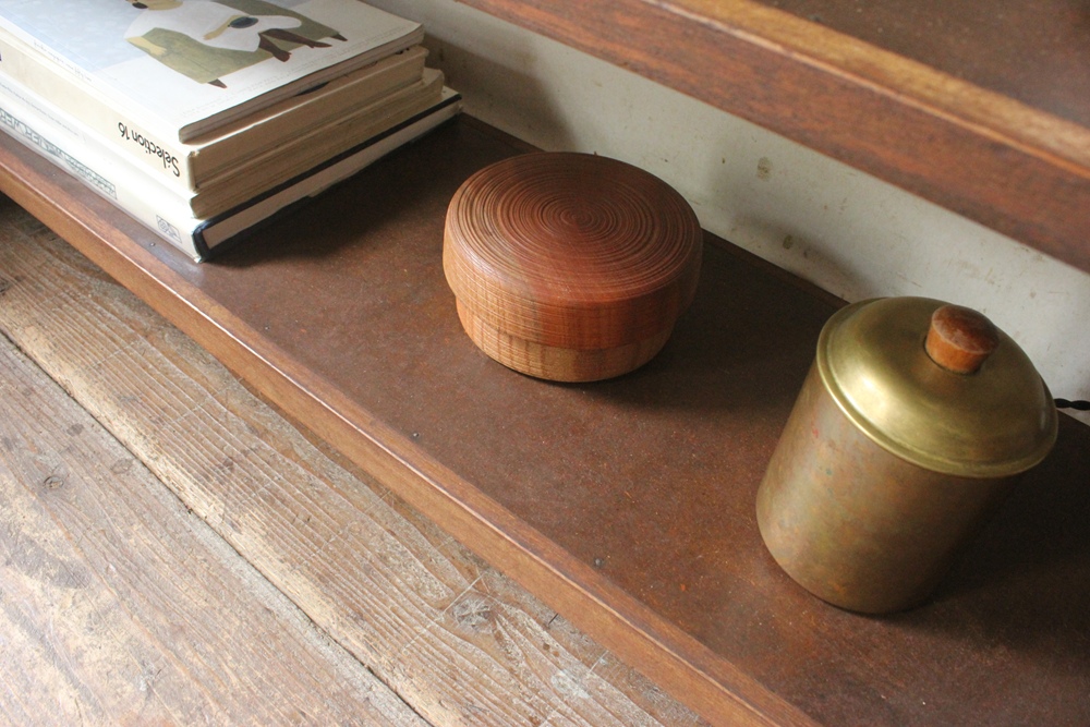 杉の棚です。素朴な杉の杢目で、あまり主張せずさりげなく使えます。よく使う器やお茶まわりのモノ収納したり、よく読む本や漫画、雑貨など飾ったり、これくらいのサイズならどこでも置けて便利ですね。