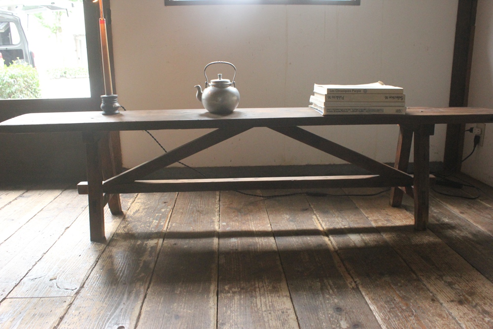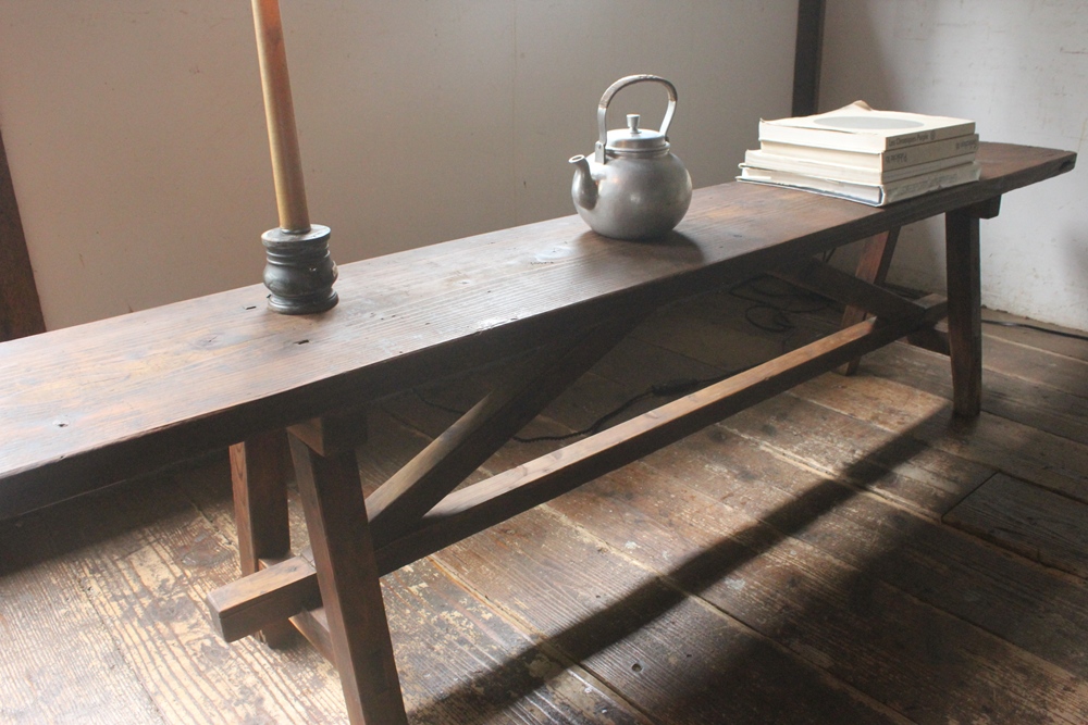 栗、桜、ナラのベンチです。みんな銘木ですのでとても味のいい杢目です。デザインもきれいで思ったより、長いところがやけに美しいデザインに見えます。空間に置くだけでよい佇まいです。廊下や壁際、部屋のど真ん中に置いてもいいですね。座ったり、本や帰ってきてカバンなど置いたり、色々使えます。どういうとこで使ってたんだろう?というベンチで想像が膨らみます。