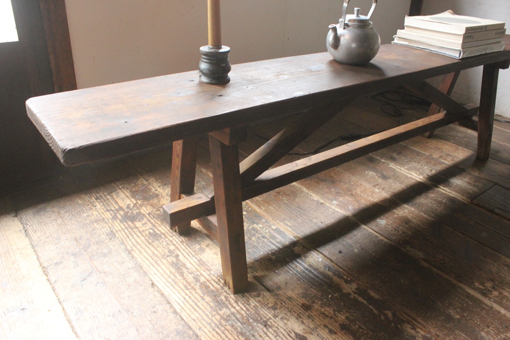 松のベンチです。油を含んだような杢目でとても良い味です。小さめですが、仲のよいふたりなら、大人ふたり座れます。テーブルに合わせても良い高さです。色々使い勝手がいいですよ。