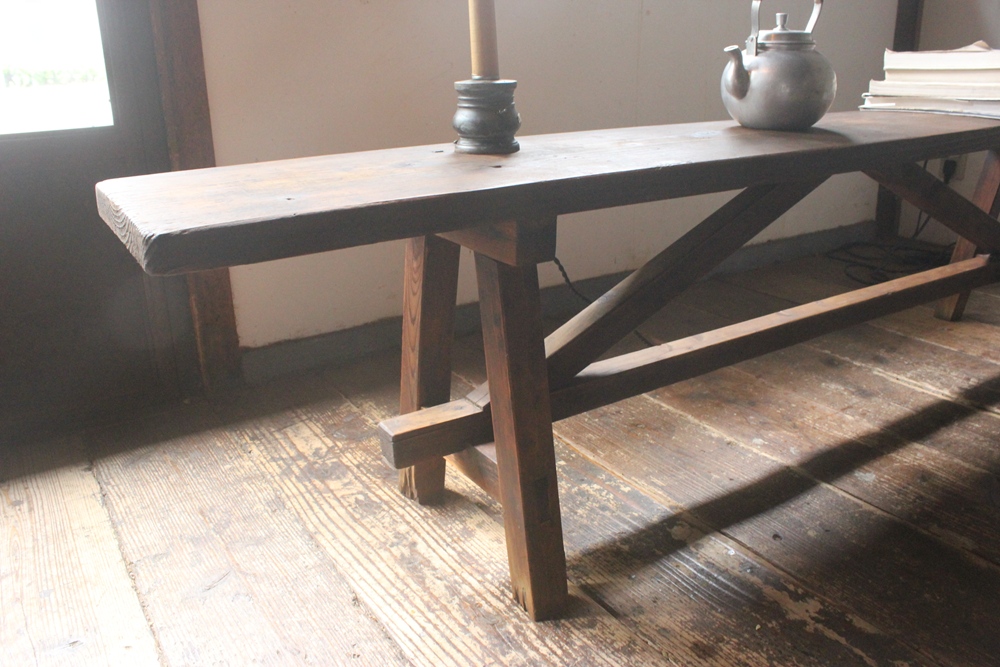 松の木のベンチです。座面は松の一枚板でとてもいい味です。座るところが広いので、しっかり座れます。テーブルに合わせて良い高さです。窓辺に置いて植物など置いてもいいですね。