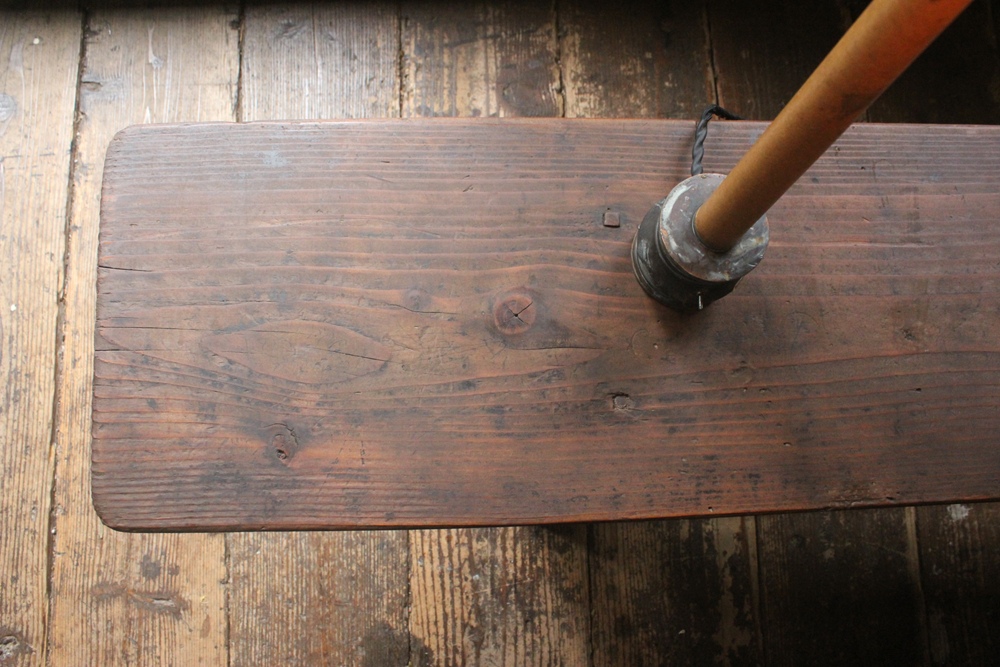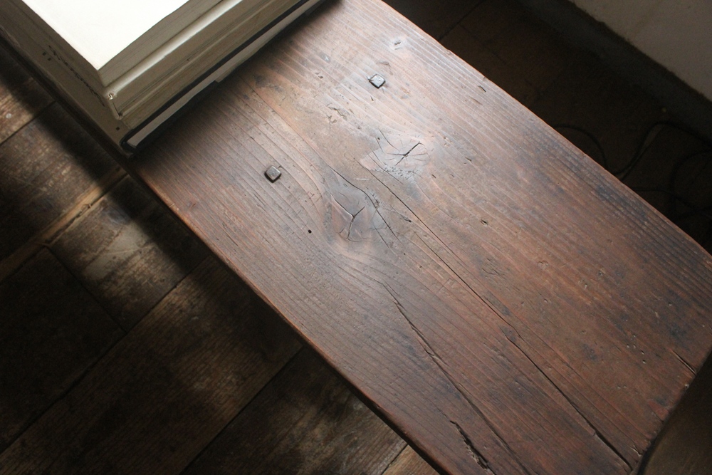 杉のベンチです。素朴な杉の木です。おそらく大正時代くらいありそうで、少し木がやせて、味があります。座るより作業していたみたいで、天板に沢山穴があいています。大人二人で、しっかり座れる大きさです。良いサイズです。