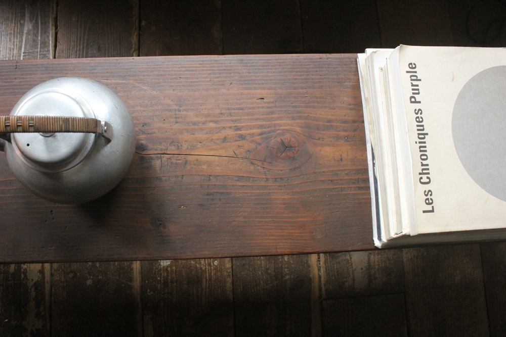松の木のベンチです。台に見えますが、ベンチです。ほんとうにムダのない美しい形です。どこかの学校で使われていたようで、落書きが残っています。座ったり飾ったりローボードみたいに使ったりベンチですからしっかりしています。