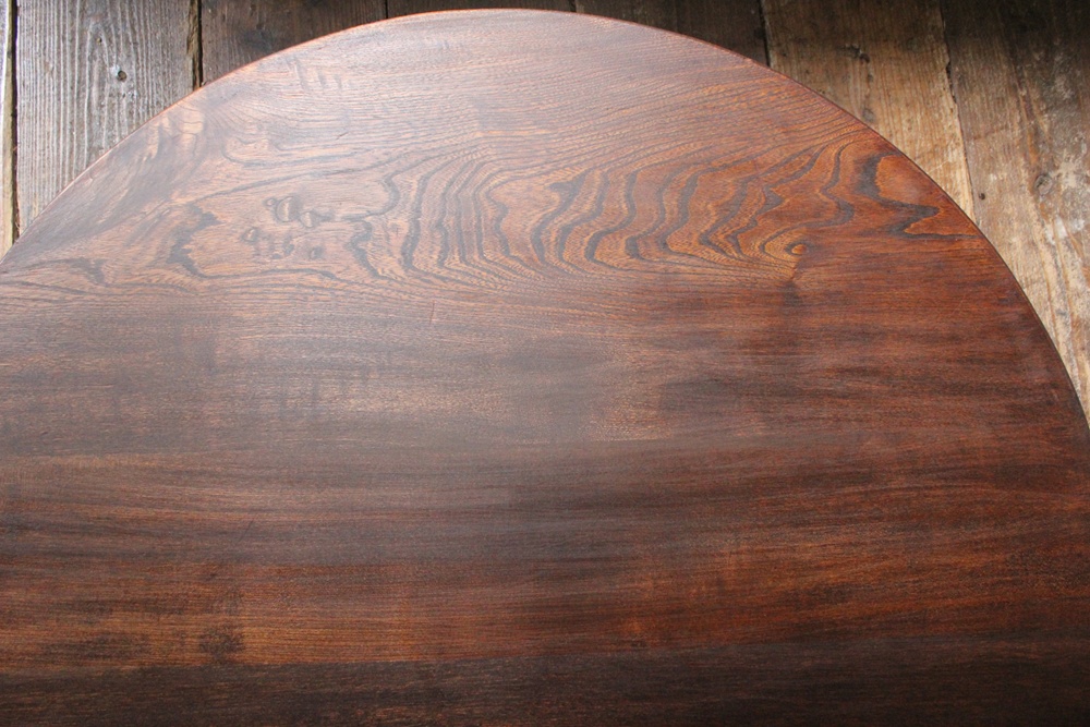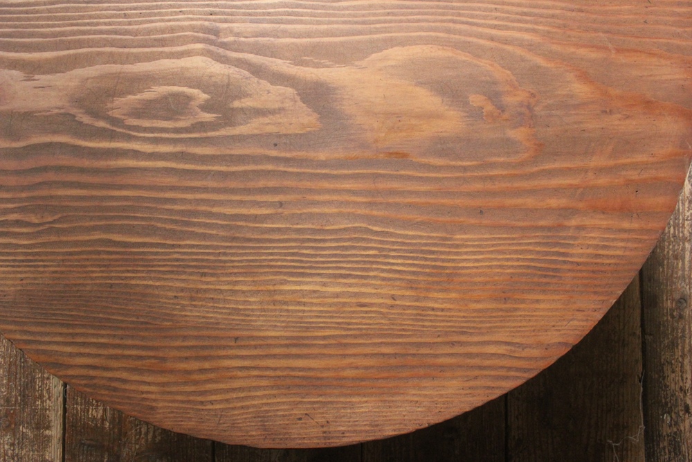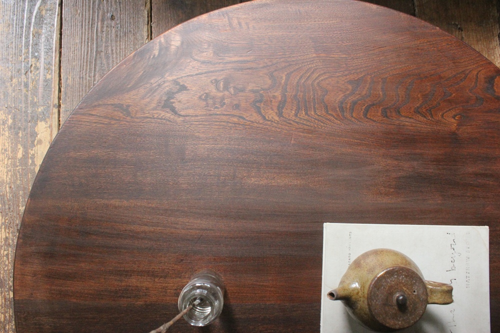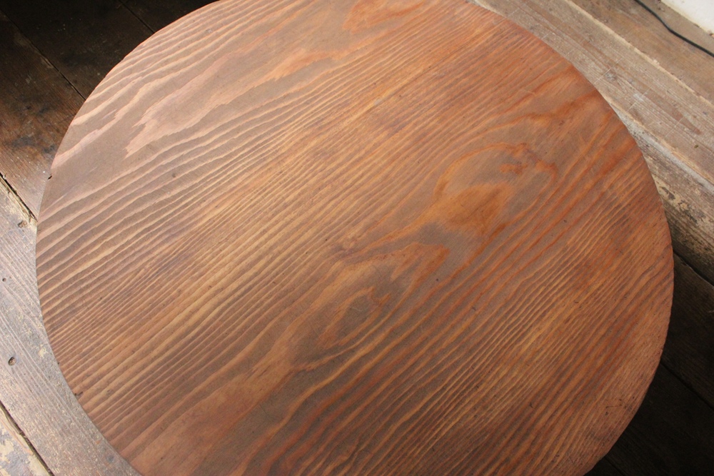 センのちゃぶ台です。流れるような杢目がきれいです。とても小さく珍品です。日本は小さいもので大きいモノと同じように作りますので丁寧に作られたものです。仲のいいひととサシ飲みやひとりでちょこちょこ楽しむにも良さそうです。小さくてとても可愛らしいです。折りたたみ出来ますよ。