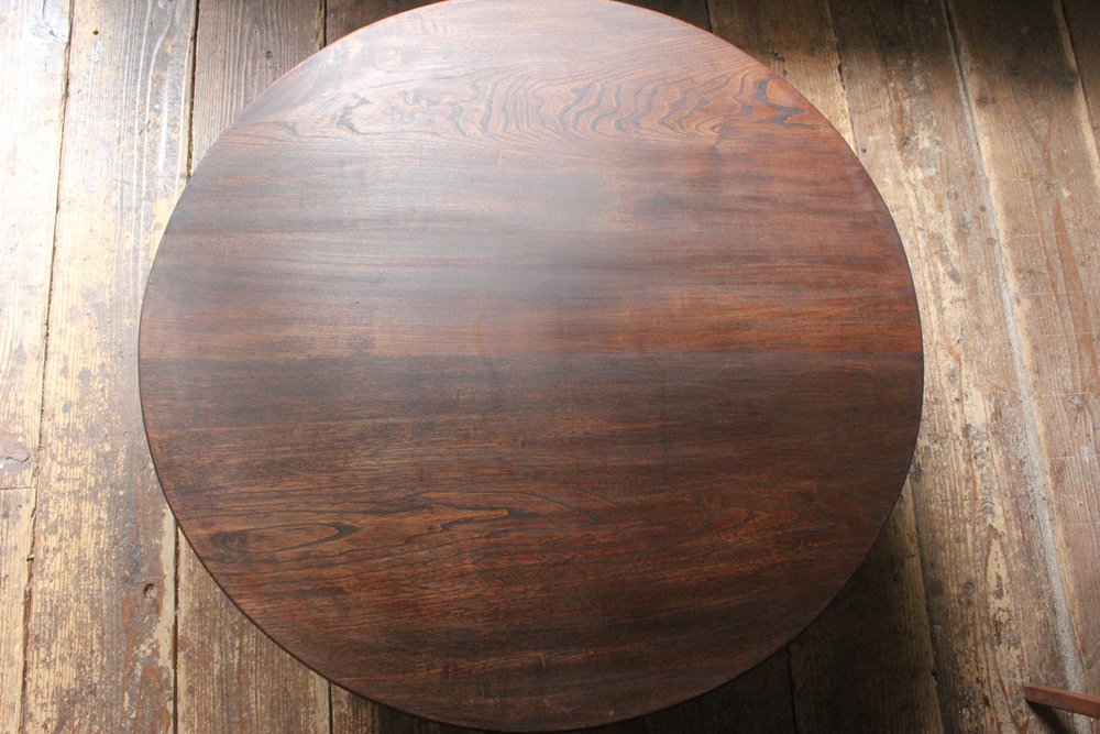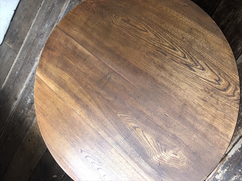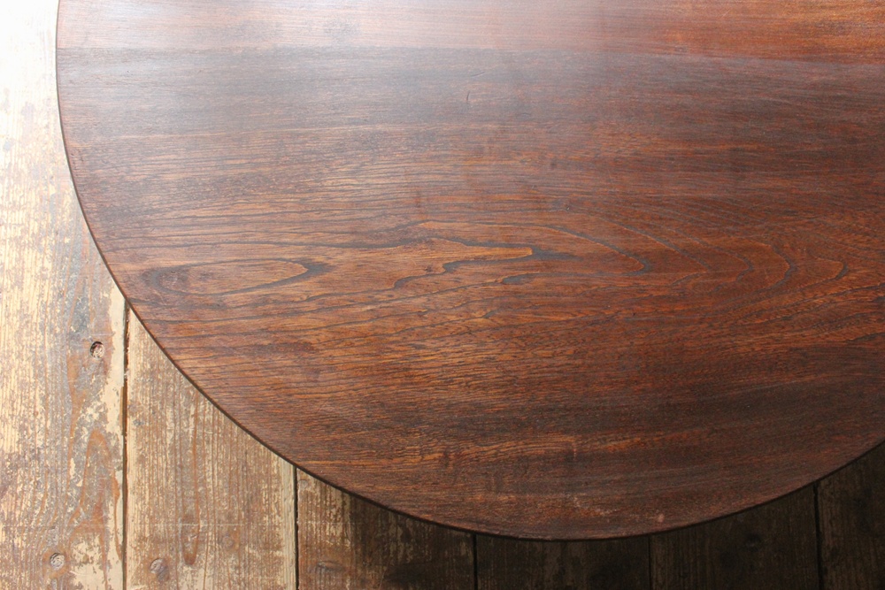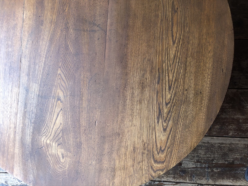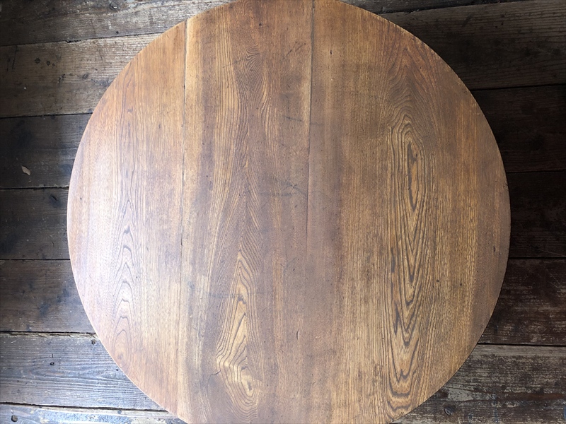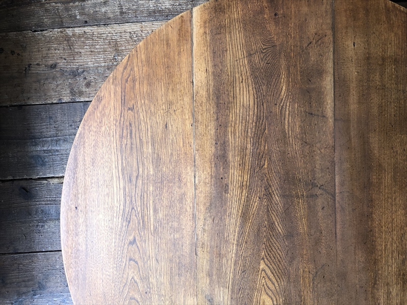 ニレという木(ケヤキの仲間)でとても品のいい木目です。サイズも珍しく、5~6人くらいでご飯が囲めますよ。脚のデザインといい、大きさといい、天板といい、きれいな佇まいです。折りたたみもできます。