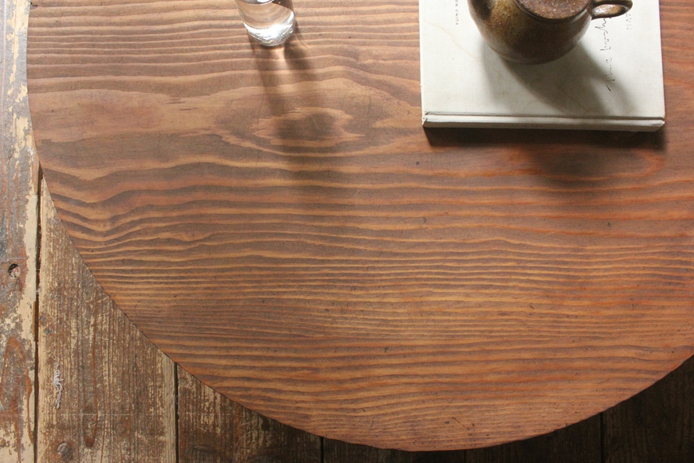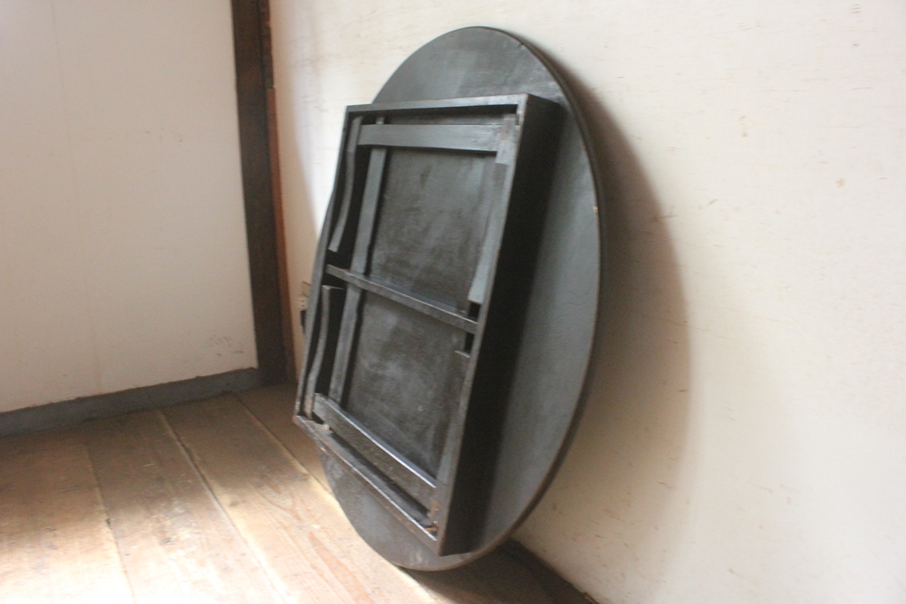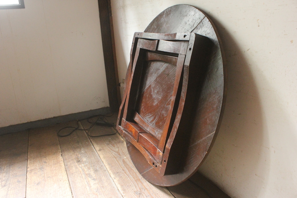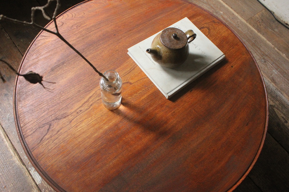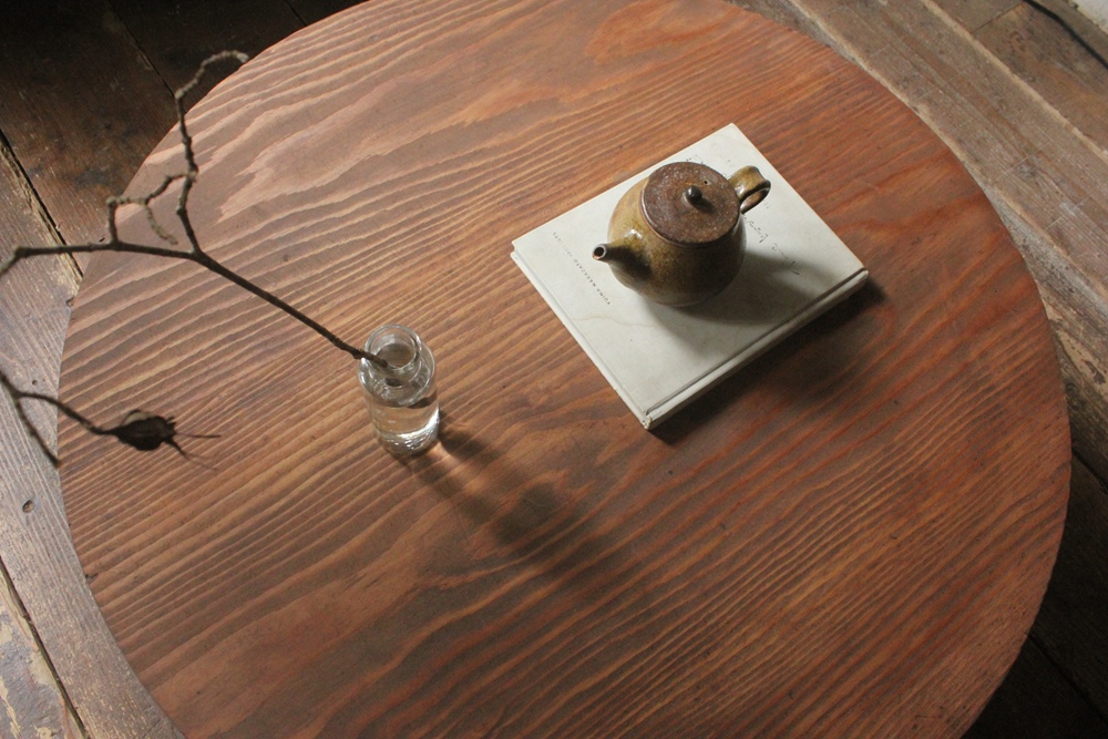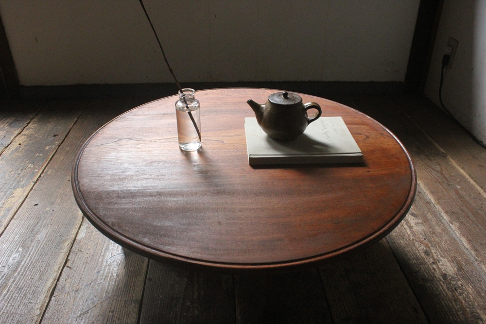センの一枚板のちゃぶ台です。一枚板で美しいのに焦げてるとことかあって愛嬌があります。このちゃぶ台はとても美しい意匠ですが構造的に痛んでいるものが多いので今回のは珍しいです。直せる範囲の状態で出てきました。ふたりのご飯やちょこっとお茶のんだり、お酒のんだり気軽に使えます。脚もシャレてますよ。折りたたみ出来ます。