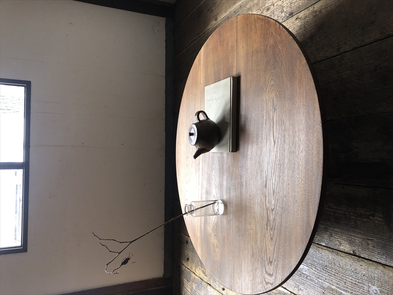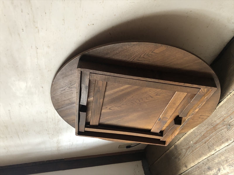 天板は山桜かカツラの木です。どっちでしょうか。脚は栗です。折りたたみはできませんが、出しっぱなしでもじゃまにならないサイズ感です。ふたりくらいのご飯や、和室でお茶を飲んだり楽しめます。
