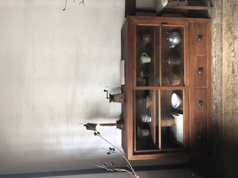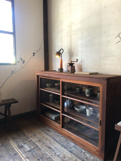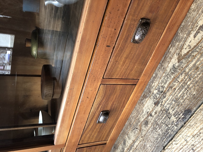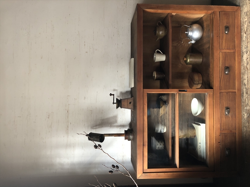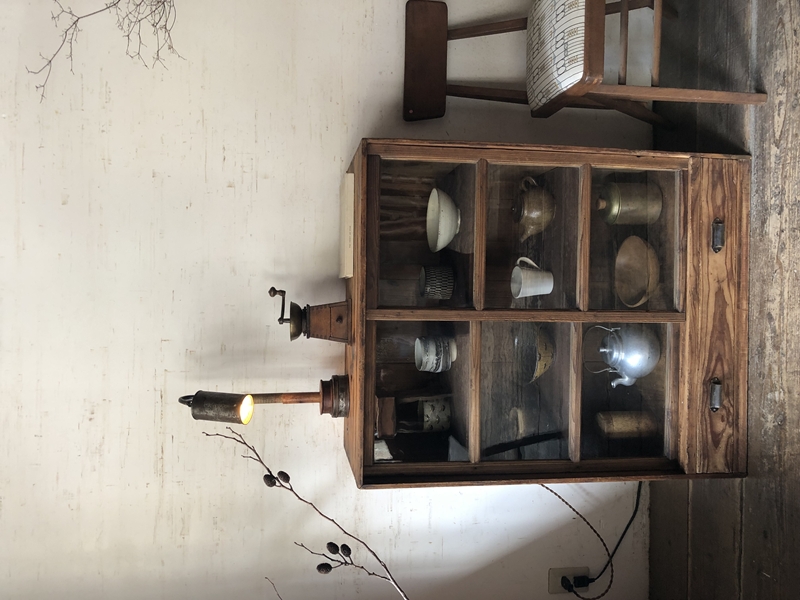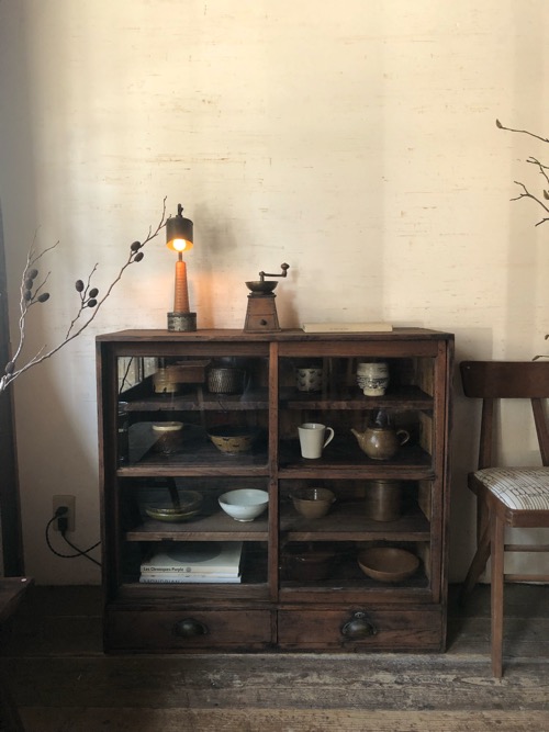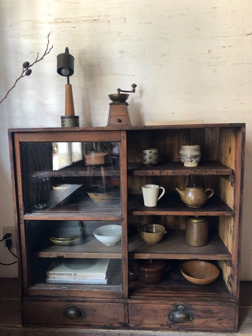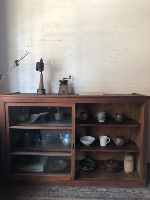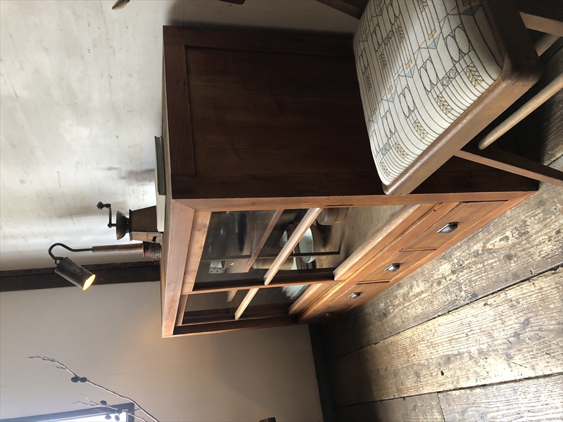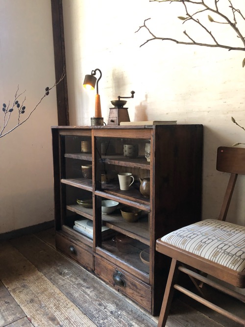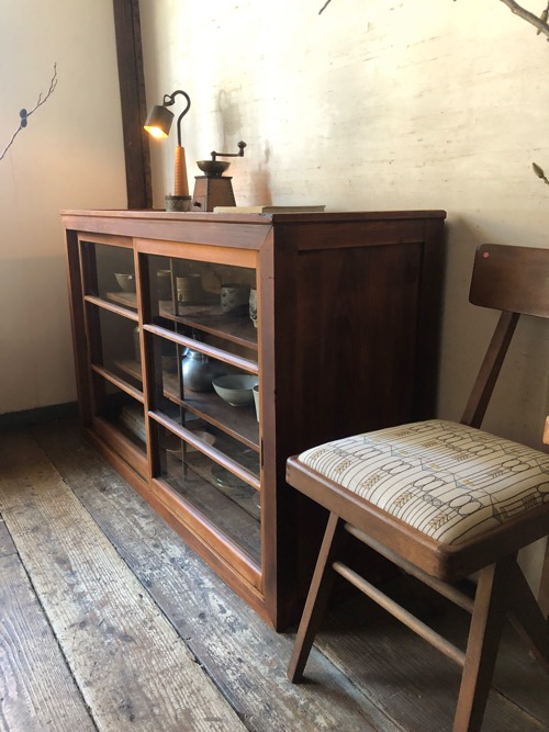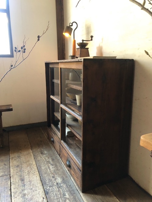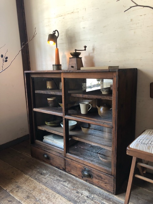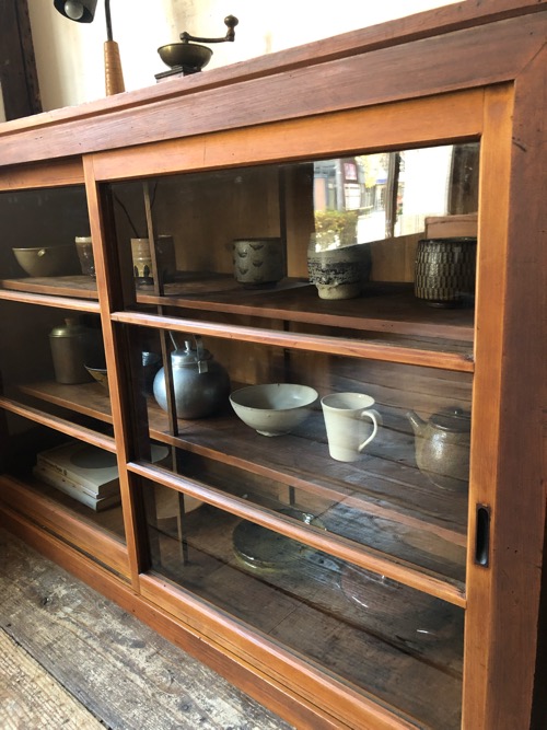 片扉のキャビネットです。大正時代のもので、取っ手も木の感じも格好いいです。お茶まわりのものだけ入れたり、酒器だけ入れてもなかなかよさそうです。