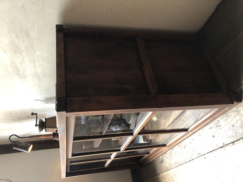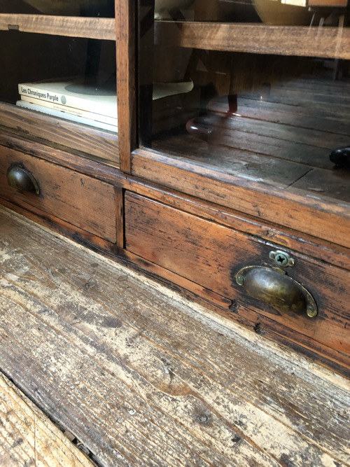 松の木の素俗な佇まいです。ガラスも古いままでとても雰囲気がいいです。本屋布類や、洋服ダンスにしても恰好いいと思います。リビングのサイドボードにもいいですよ。
