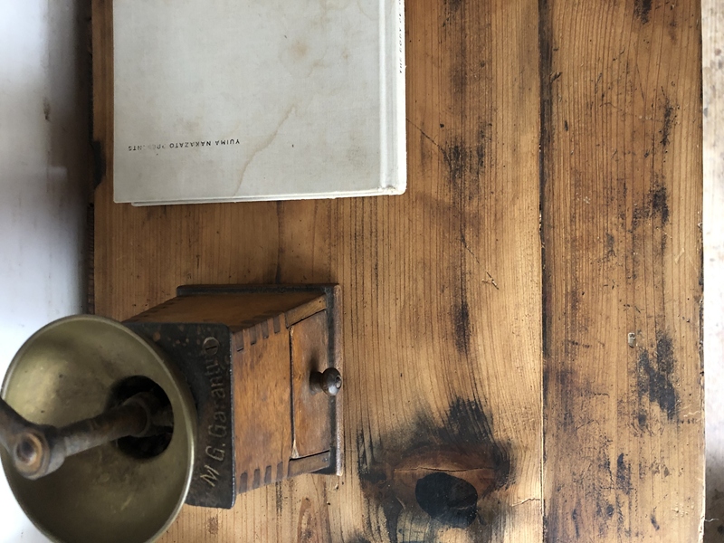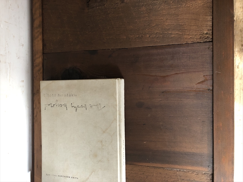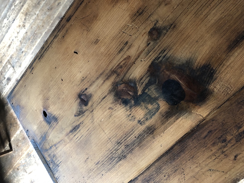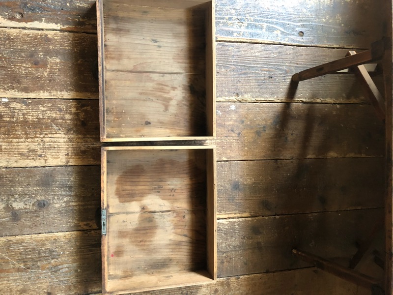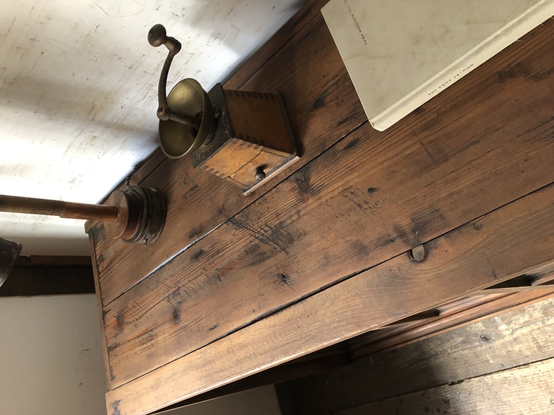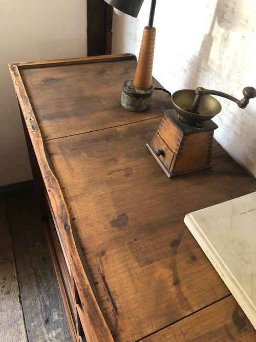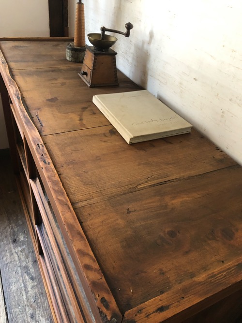 杉の水屋です。素朴で味の杉の杢目です。とても簡素なつくりで華奢で良い佇まいです。側面に隙間があったり、背板はべニア板だったり、でも素人作りではなく職人さんが自分用に適当に作ったのかな?という感じです。ウチの職人さんが必要なところは補強してちゃんと修理してますので、ガンガン食器を入れても大丈夫ですのでご安心ください。