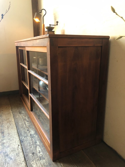 サブの食器棚に使ったり、お茶まわりのものを入れたり、お部屋において、本や小物などを入れたり、これくらいのサイズなら、どこでも置きやすいです。昭和のはじめくらいのもので。いい雰囲気です。