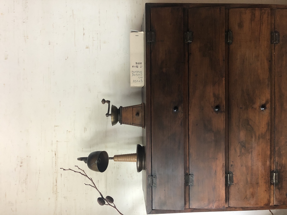 松の木の下駄箱です。小さいサイズでとてもかわいらしいです。中もきれいですので、食器や布類などの収納にもいいです。家具の上に置いても圧迫感がない大きさです。