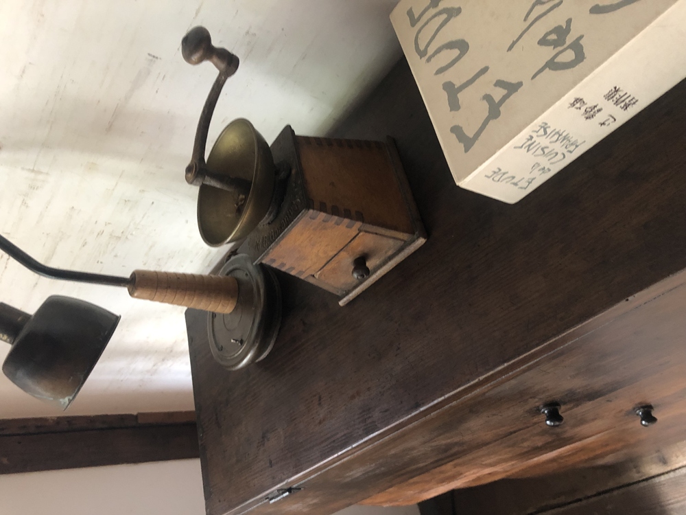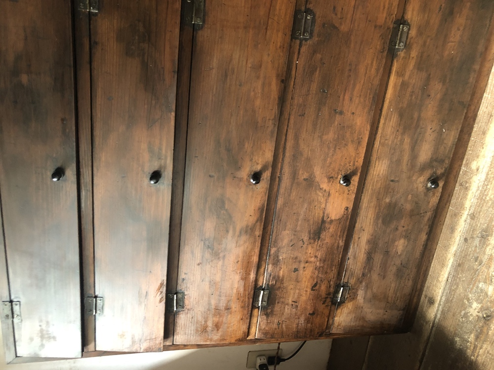 桜の木の下駄箱です。桜の上品さというよりは、野生っぽい桜で、とても味があります。元々作った人がおおらかだったので、とてもラフでおおらかな作りですが、職人さんがしっかり修理しましたので、今はしっかりしてかえって良い味になっています。靴は約20足入ります。下段にはブーツなども入りますよ。