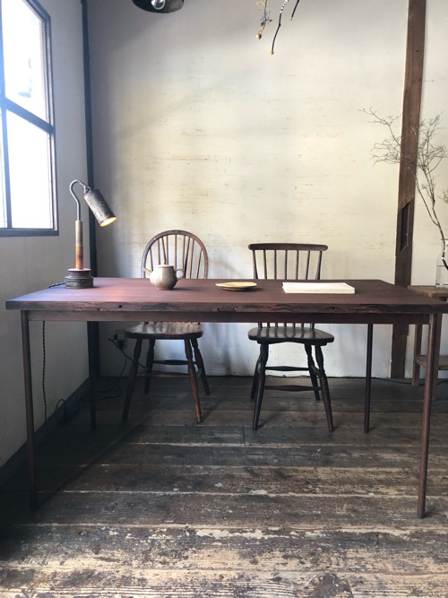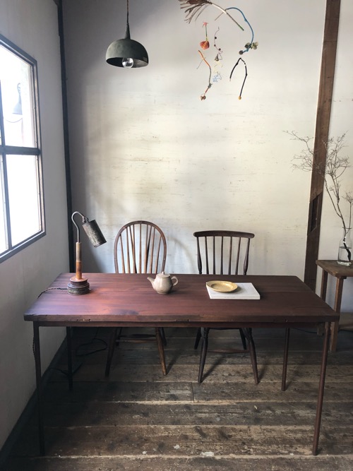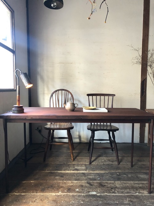 古い天板にオリジナルの鉄脚を付けています。奥行きはあまりありませんがダイニングテーブルにも使えます。脚まわりがすっきりしていますので作業台などにしても、動きが取りやすいです。錆びた鉄の味がいい雰囲気です。