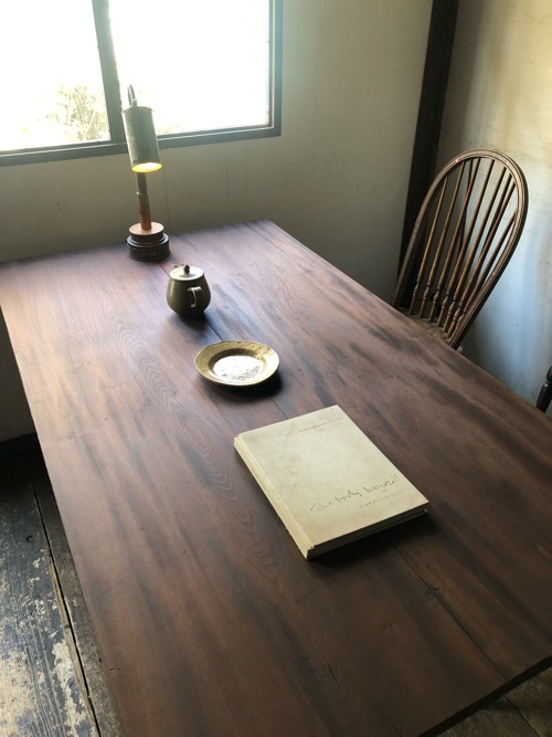 栃の一枚板のテーブルです。トチ独特の妖艶な杢目です。脚はベージュグレーのような色で剥げたかんじがかろやかで良いですね。棚も付いているので本も入ります。窓辺に付けたり、台所でカウンターみたいに使っても良さそうですね。