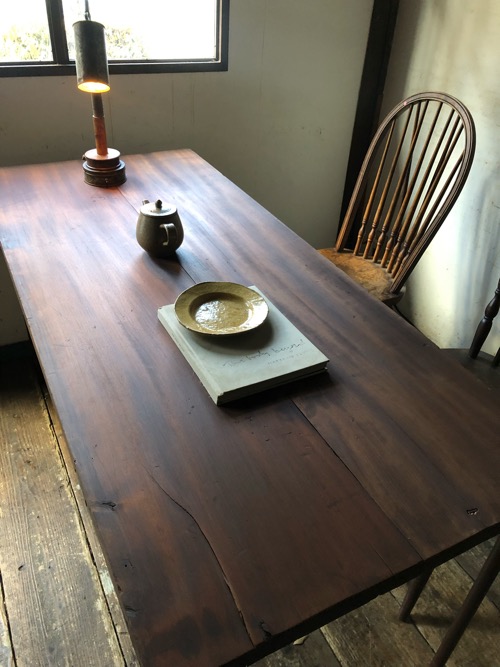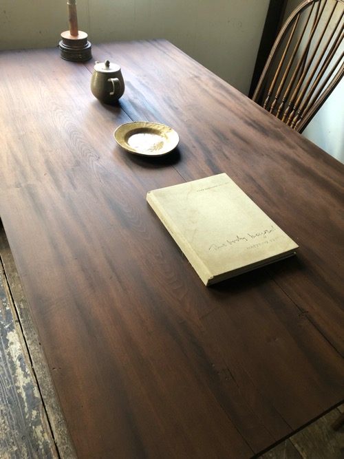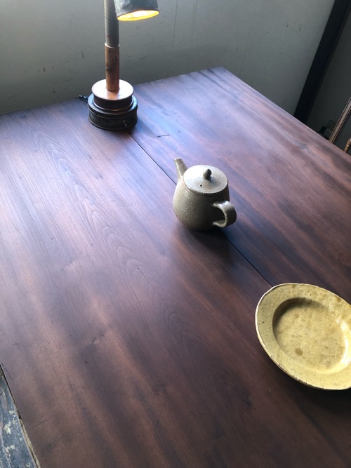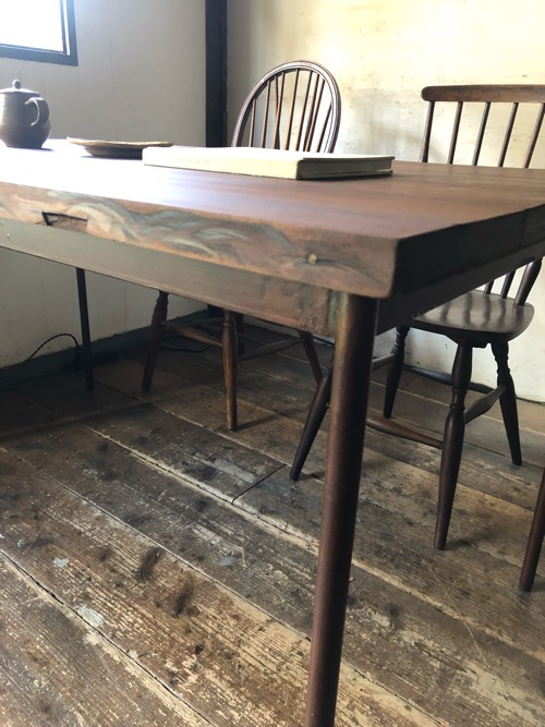 天板は栗の一枚板で、全部栗の木で作られた机です。なんとも味があり、いい雰囲気です。脚のあいだに木がありませんので、四方向から椅子が入ります。2~4人くらいで、ご飯が囲めます。