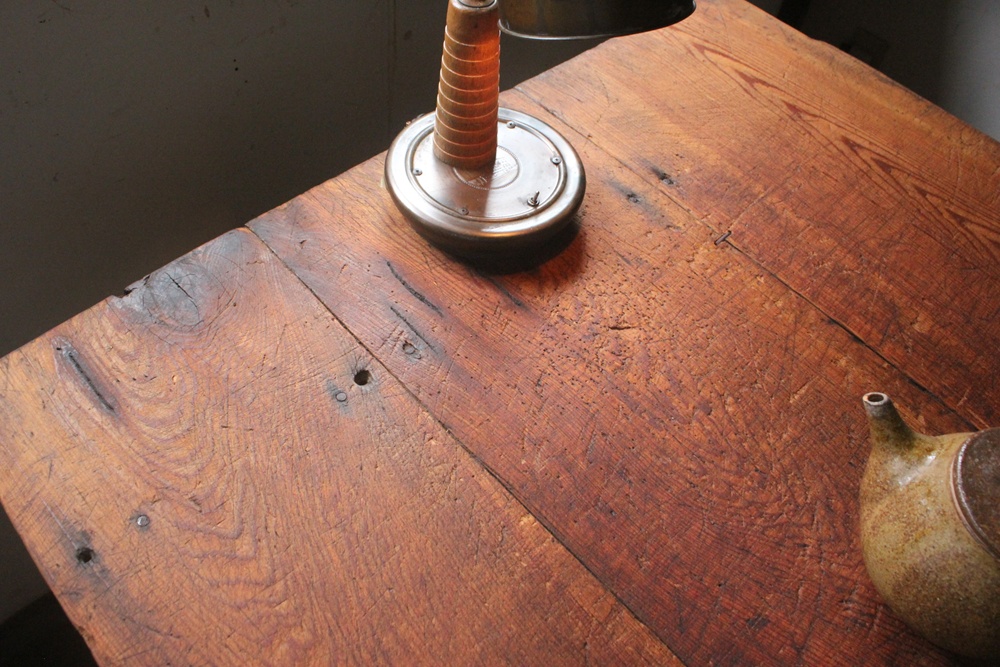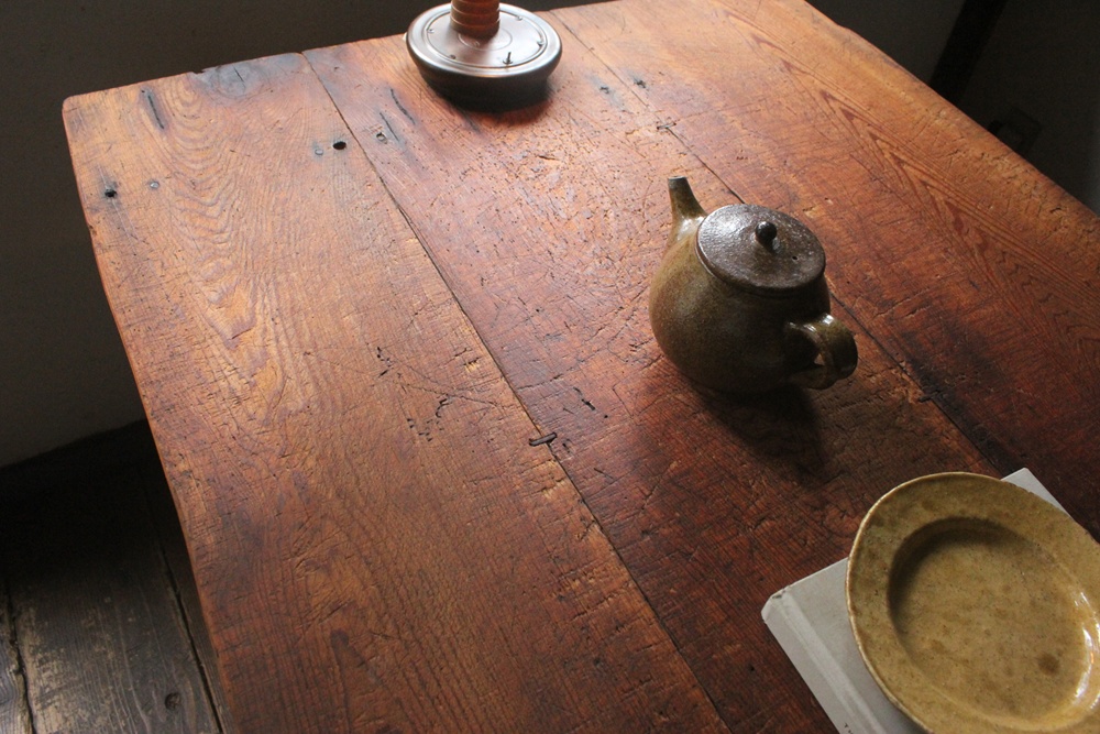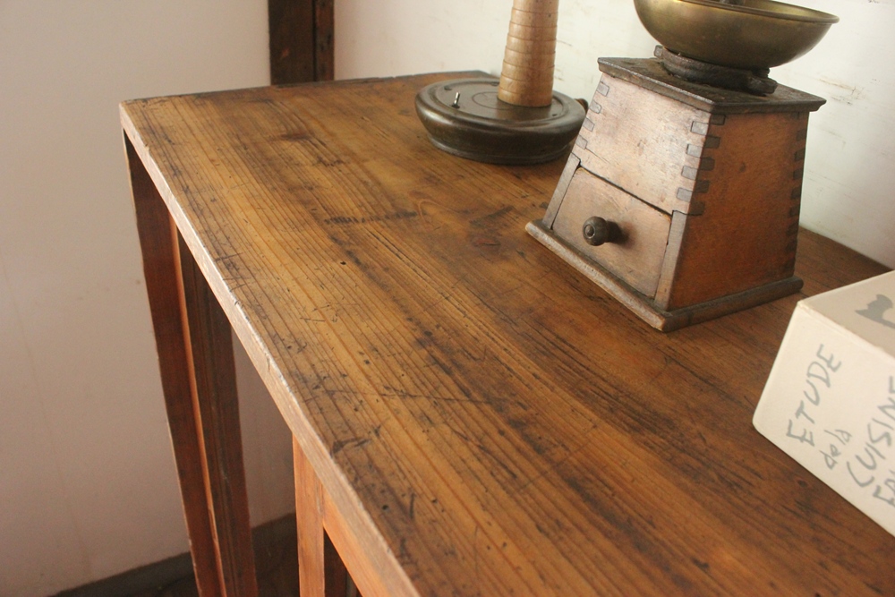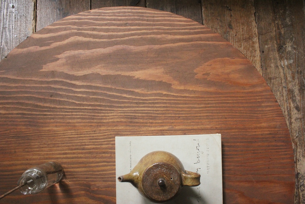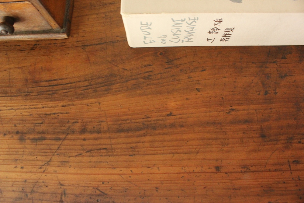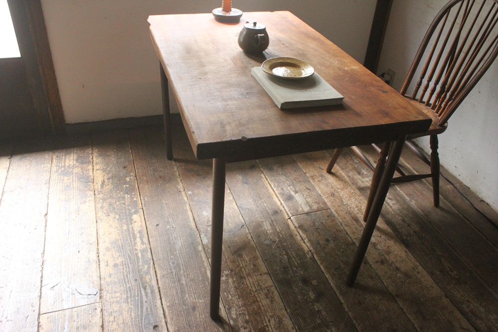栗と松のテーブルです。天板が栗の木で脚などは松の木です。素朴で良い佇まいです。引き出しがついているので、脚が入るような入らないような感じです。メインのテーブルよりは、お茶をのんだり、ご飯を食べたあとに、お酒をのんだり、休憩に使ったり、そんな使い方が楽しそうです。4人くらいでゆったり囲める大きさです。