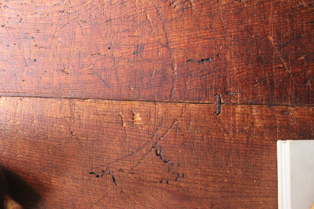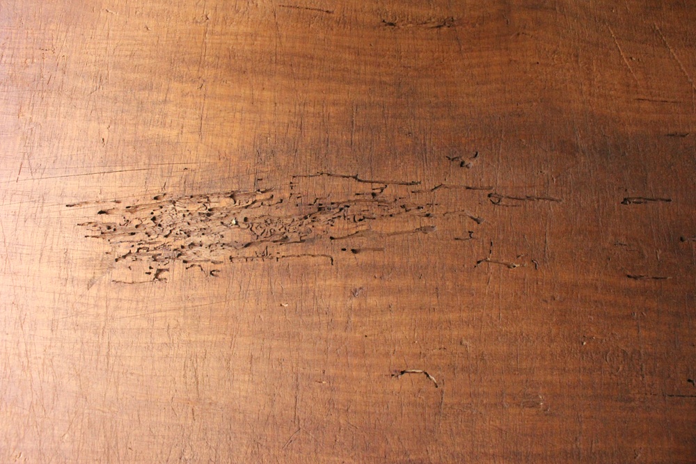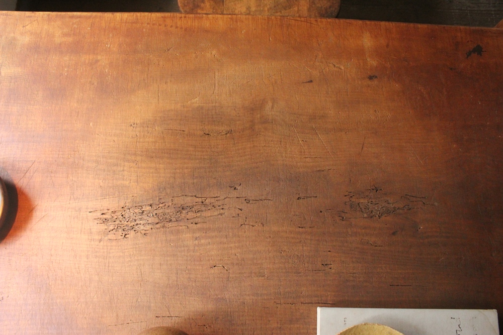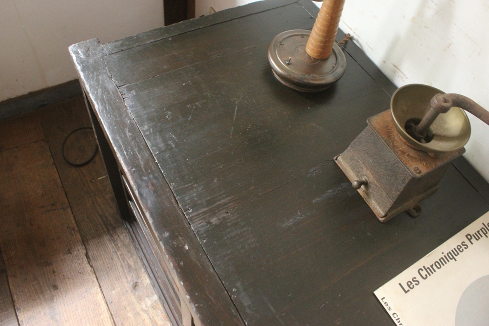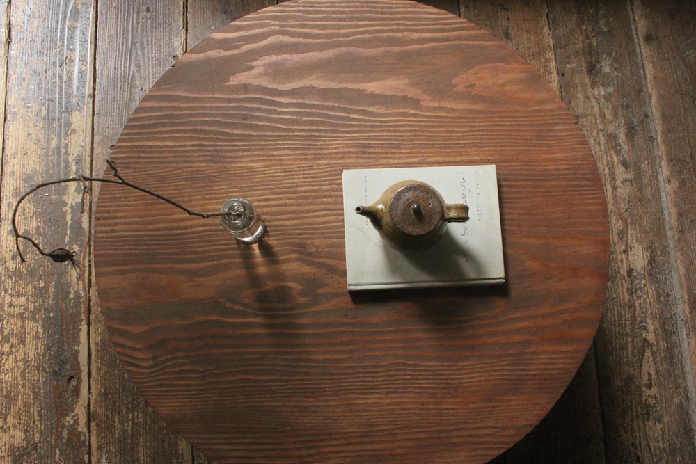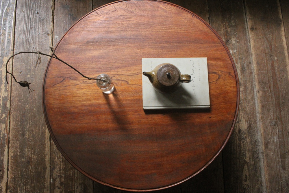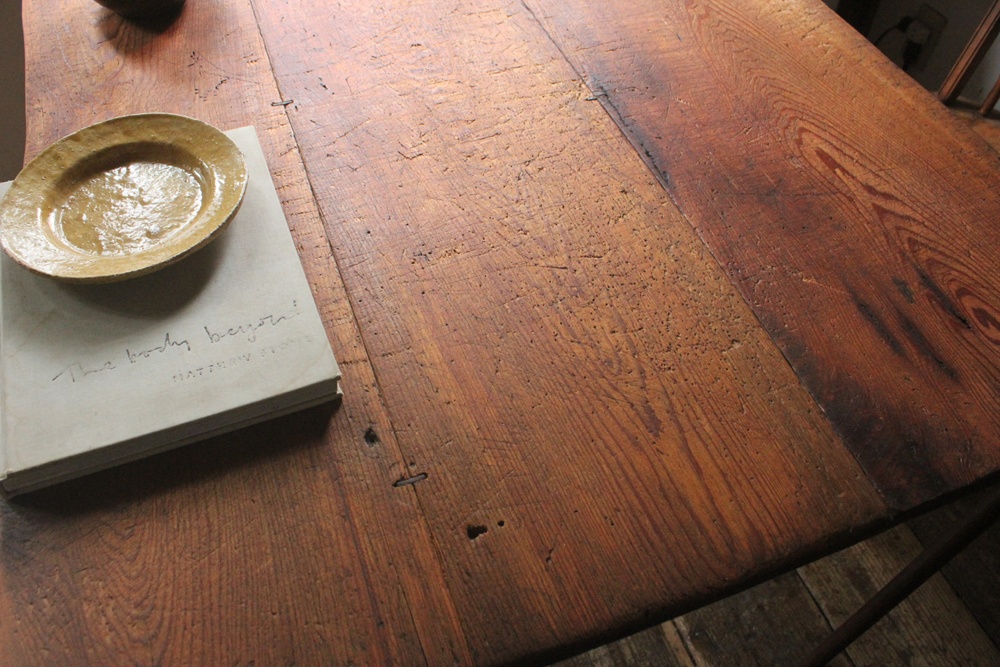 栗と松のテーブルです。天板が栗の木で脚などは松の木です。素朴で良い佇まいです。引き出しがついているので、脚が入るような入らないような感じです。メインのテーブルよりは、お茶をのんだり、ご飯を食べたあとに、お酒をのんだり、休憩に使ったり、そんな使い方が楽しそうです。4人くらいでゆったり囲める大きさです。