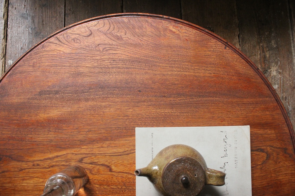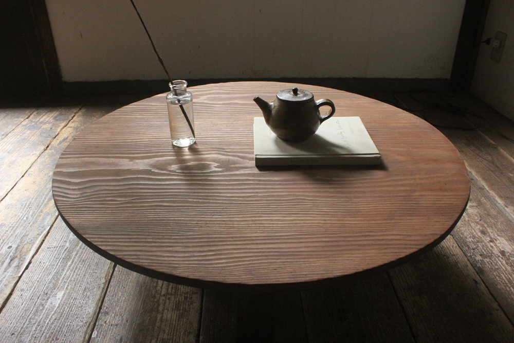 センのちゃぶ台です。流れるような杢目がきれいです。溝が良いアクセントになっていてすこし洋っぽくも見えます。いつもはふたり、たまに3人くらいのご飯にいいサイズです。洋間にも和にも合いますよ。折りたたみ出来ます。