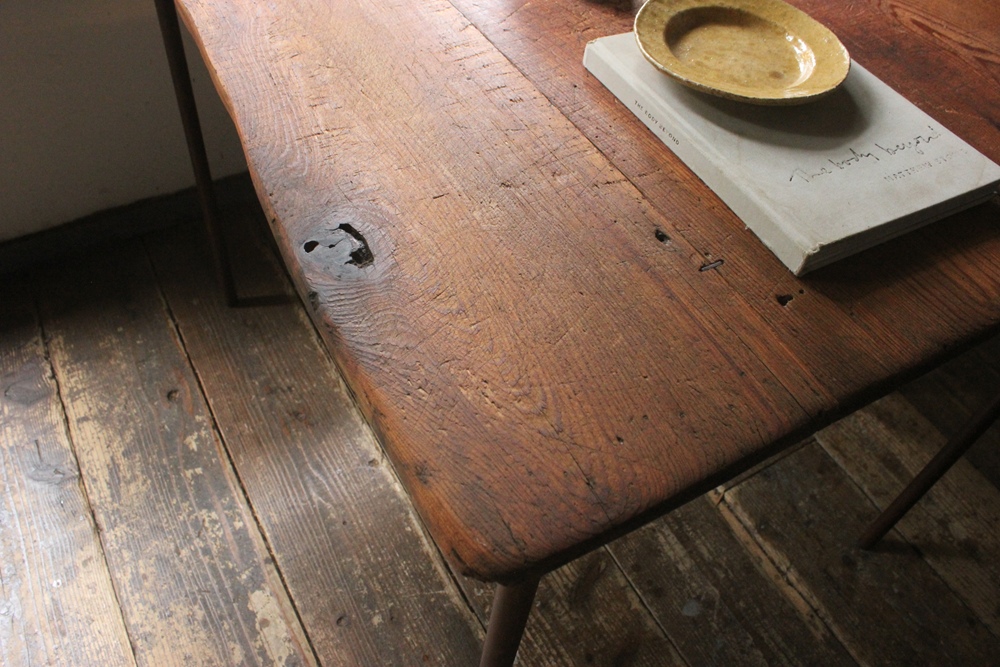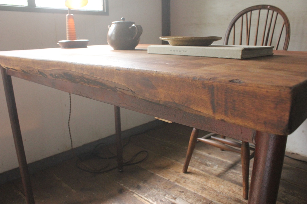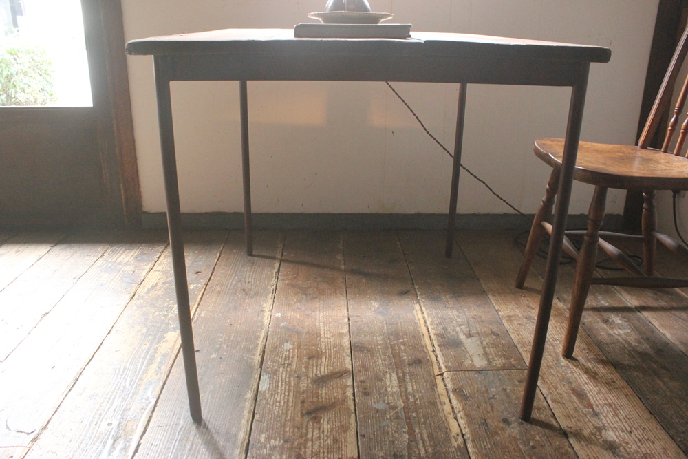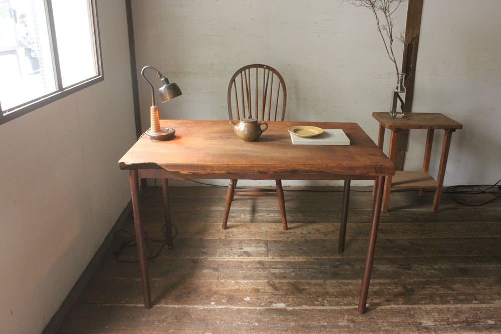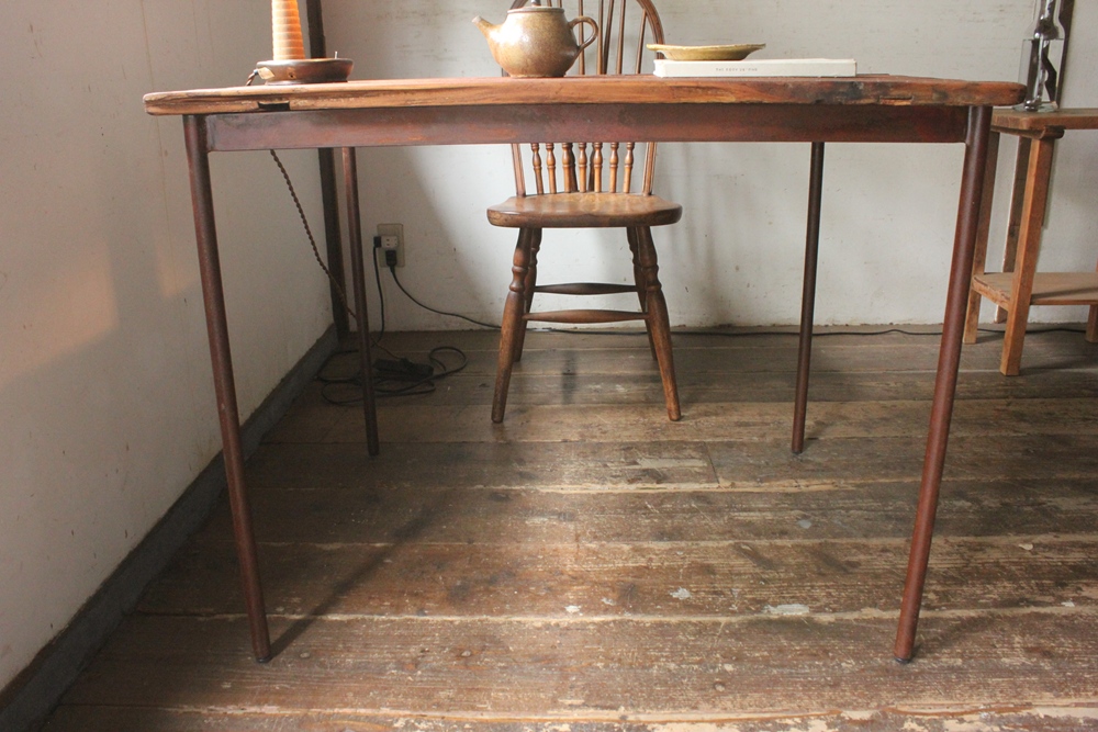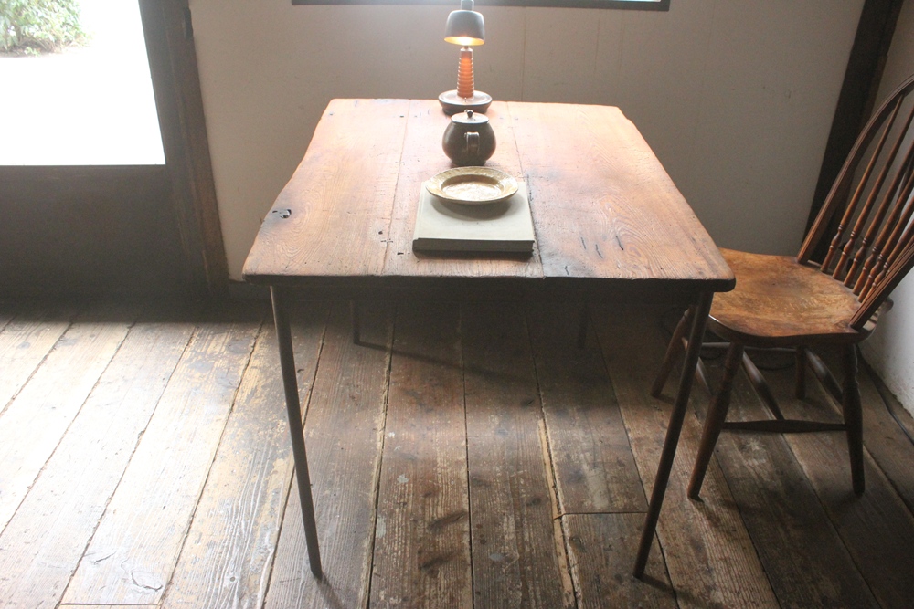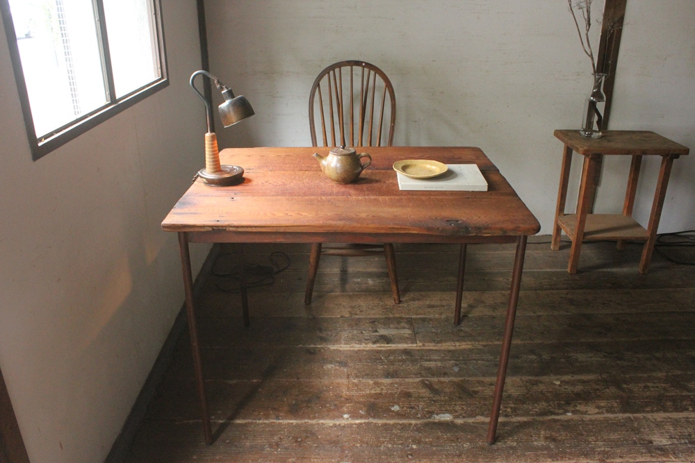 杉のテーブルです。枯れた杉の木で使いこんだ良い味の天板です。渋いです。小さめのキッチンなどでも置きやすいです。和でも洋間にもスッと馴染みます。いつもはふたり、たま~に4人くらいのご飯にいいサイズです。脚は鉄製です。底面にアジャスターが付いています。