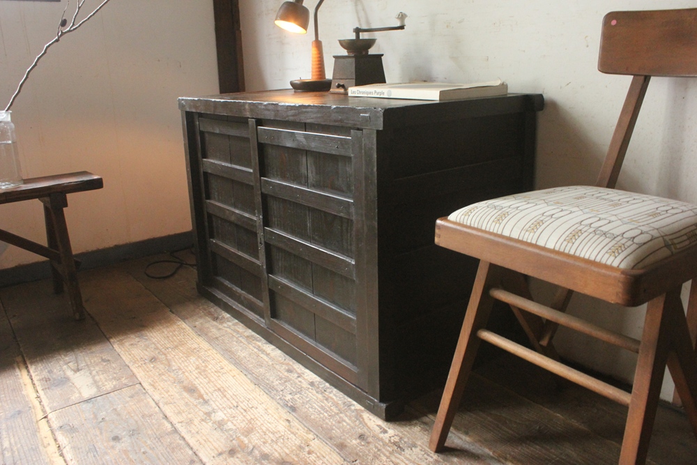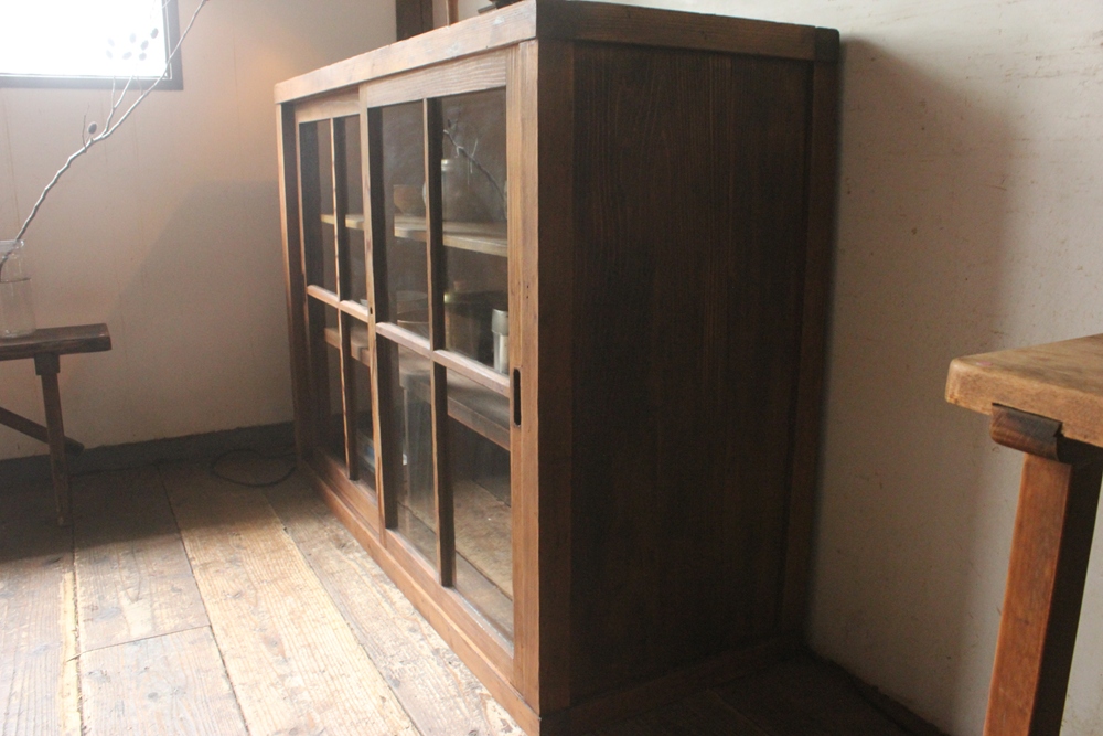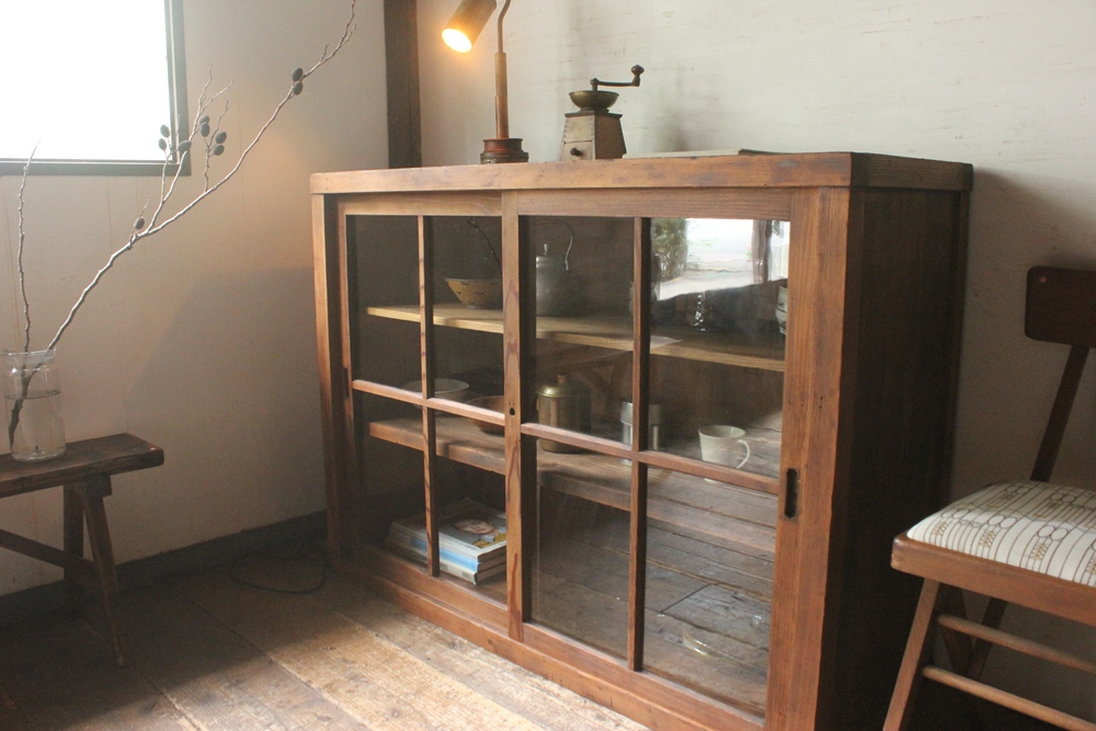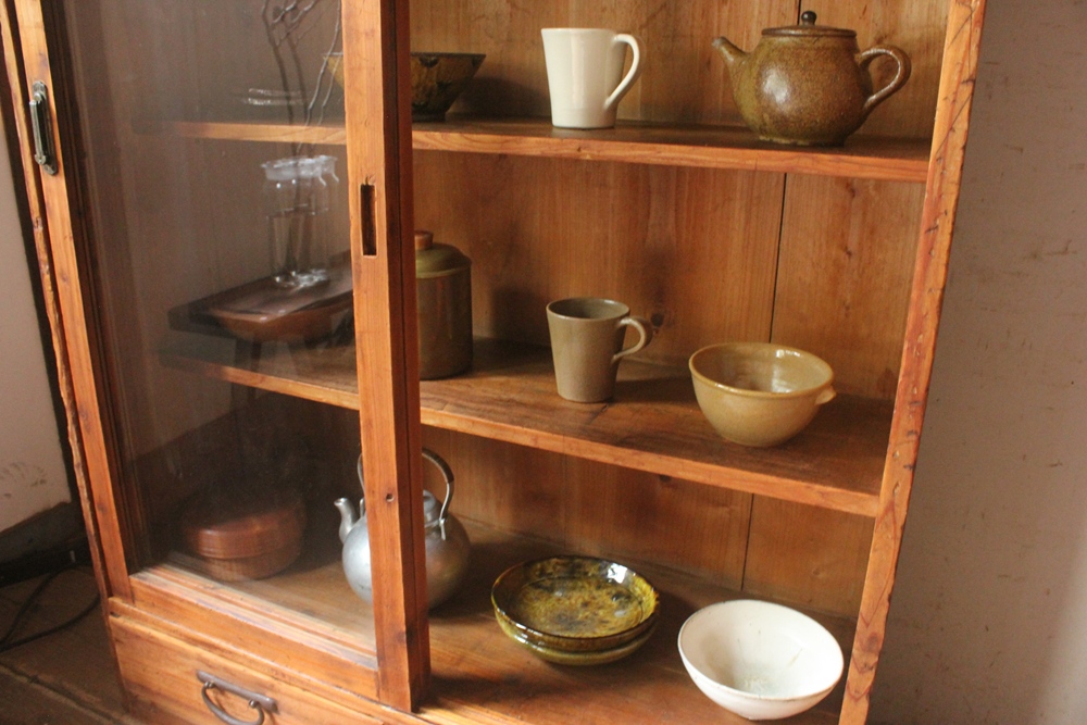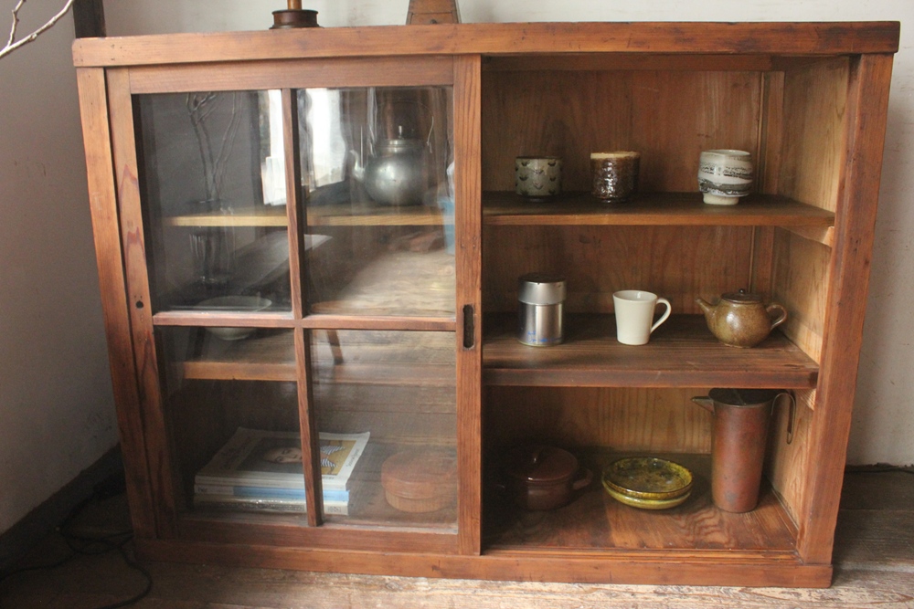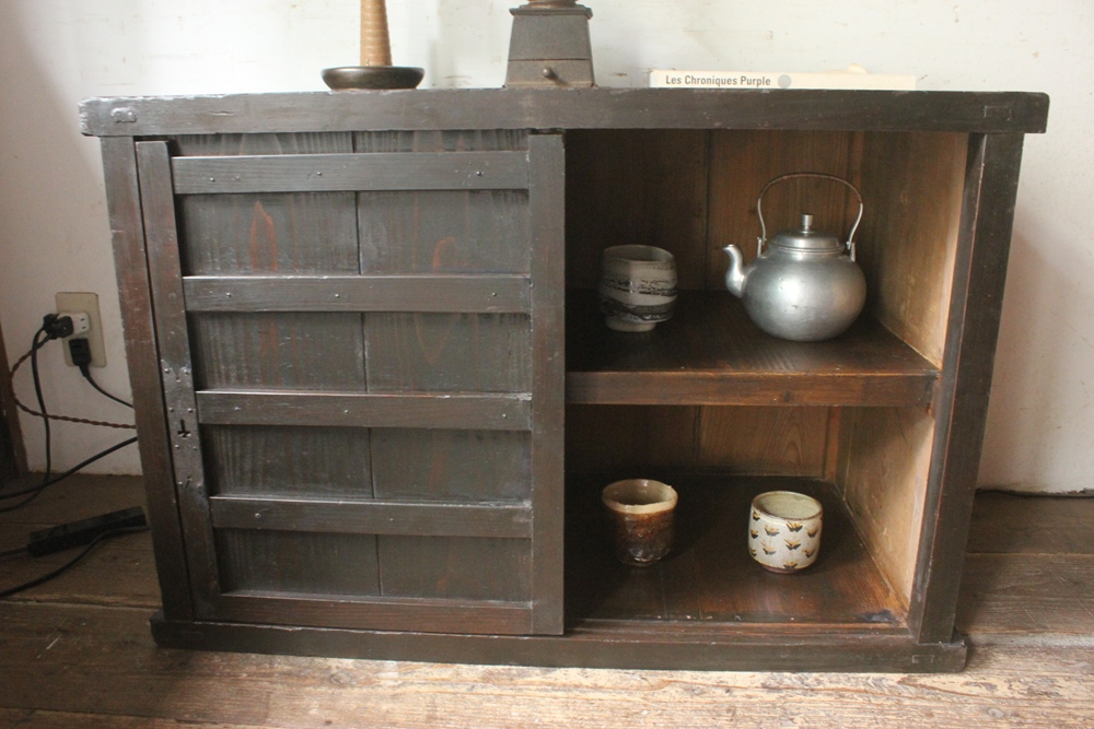 松の木の水屋です。とても渋い色です。民芸ですが、ここまできれいだとどこか外国のものにも見えてきます。むちゃくちゃ和にしたり、いっそ違う素材や国のものと合わせたり、思った以上にすっきりまとまります。サイズも適当で、お家で使いやすいです。収納力も高いです。