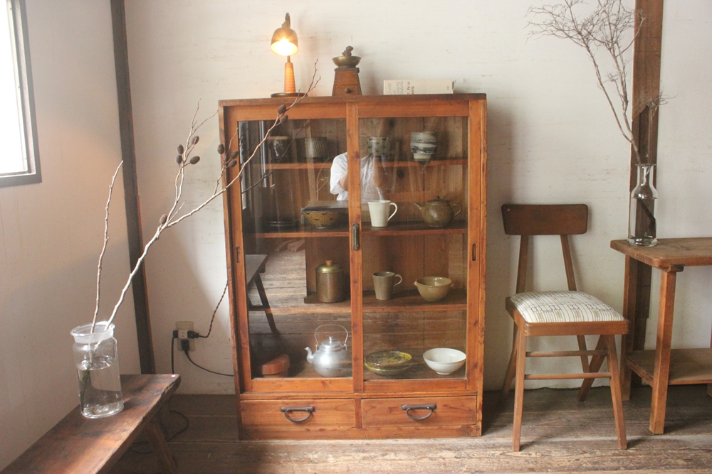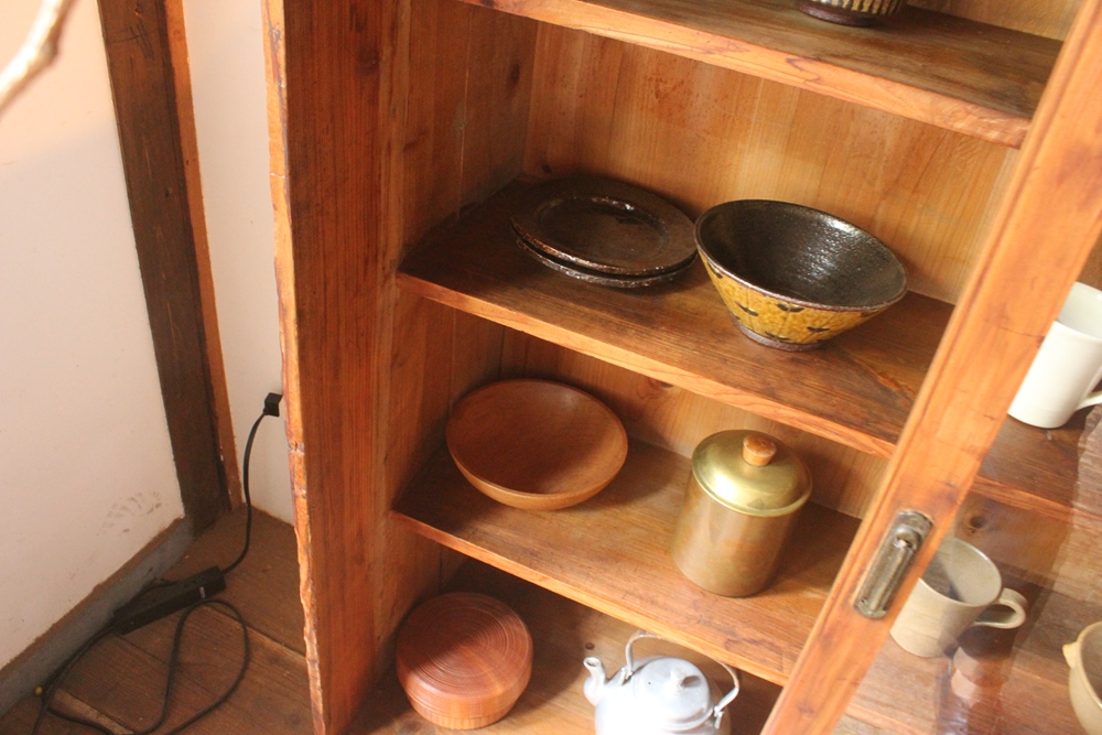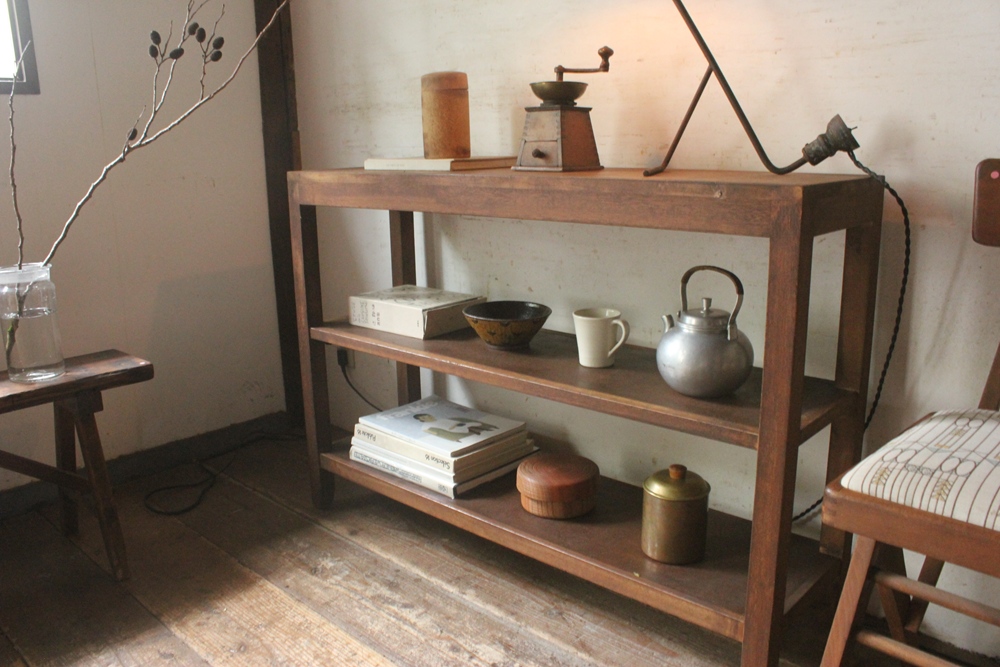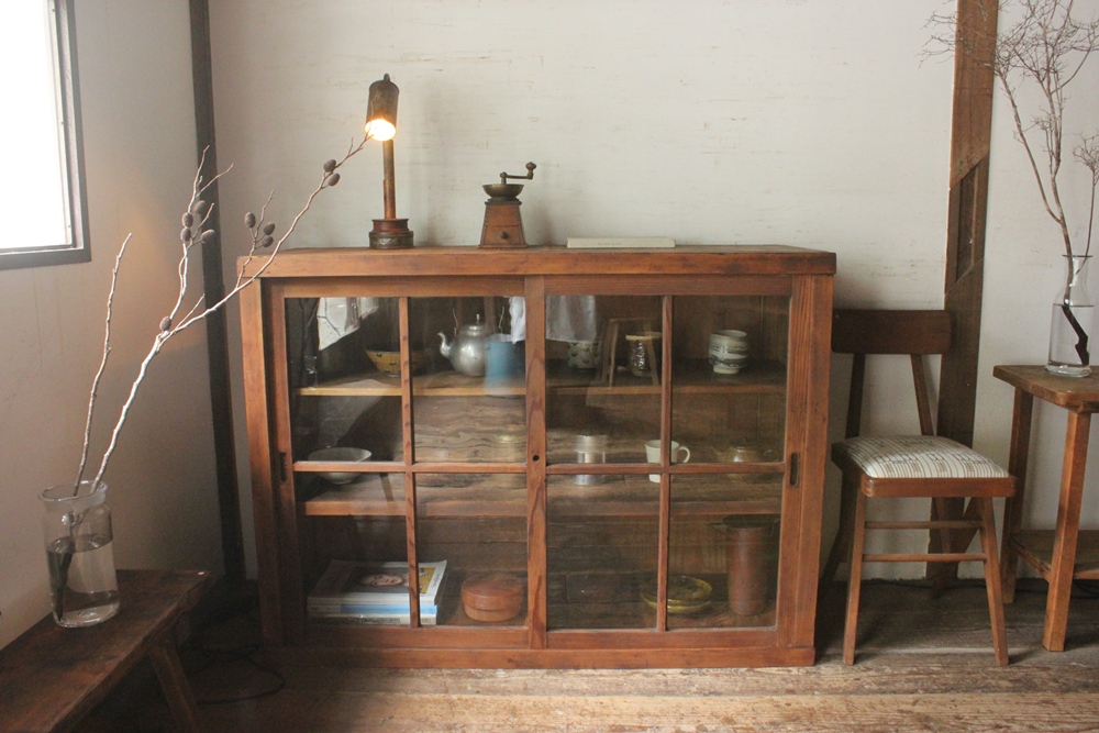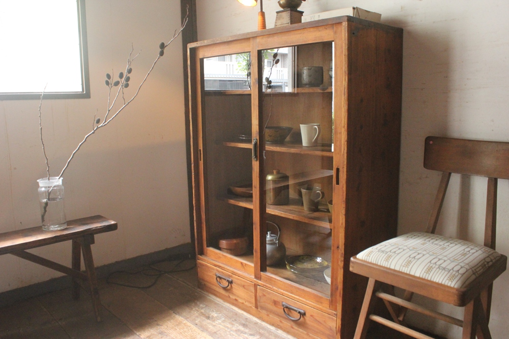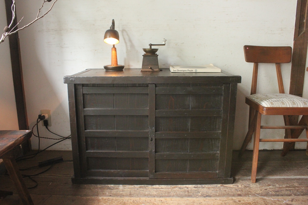 松の木の水屋です。とても渋い色です。民芸ですが、ここまできれいだとどこか外国のものにも見えてきます。むちゃくちゃ和にしたり、いっそ違う素材や国のものと合わせたり、思った以上にすっきりまとまります。サイズも適当で、お家で使いやすいです。収納力も高いです。