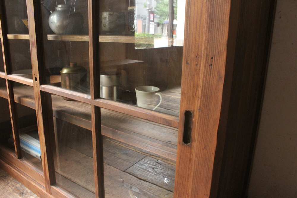 松と檜と杉の水屋です。枠が松、戸がヒノキです。とても渋くいい色です。明治の薬局で使われていました。細部まで意匠がきれいです。大きいですが奥行が狭めですっきり美しいです。民藝にもモダンにも見えます。町屋などの古いお家からシュッとした空間や洋の佇まいのお家からスッとおさまります。いいモノは寛容ですね。棚板は右下段が1枚外せますので本や背の高いものの収納も出来ます。