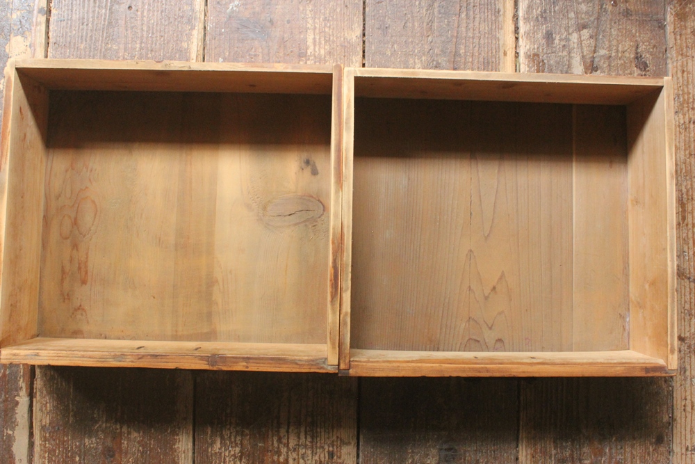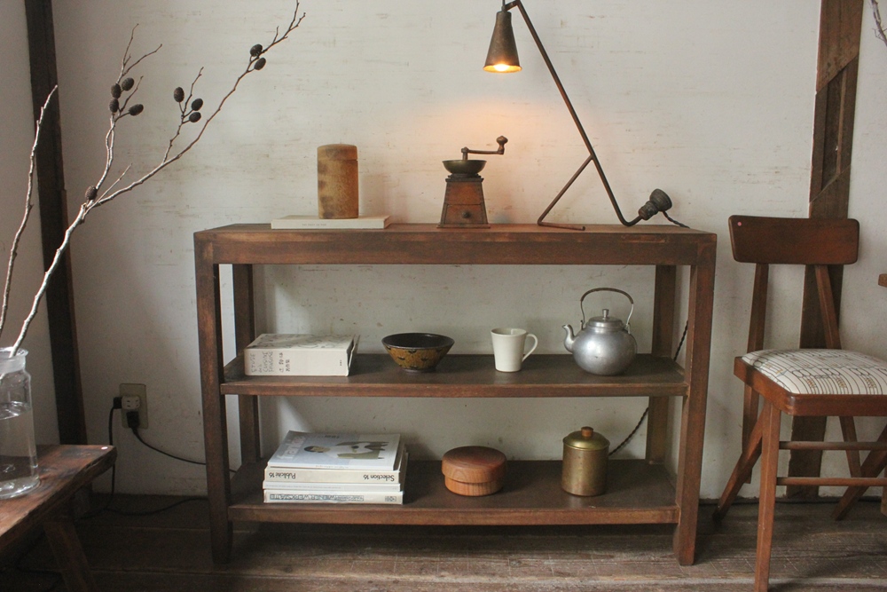 松の木の棚です。松独特の少し油を含んだような、しずかでカッコいい杢目です。棚板も分厚く、横から見てもとてもキレイです。元々、和菓子屋さんでお餅などを並べていたような棚です。そのせいか力強いですが品があります。お店で什器に使うのはもちろん良いし、お家でも手におえる大きさです。壁に付けても間仕切りでもどちらでも。飾ったり、商品並べたり、洋服の収納に使ったり、道具類を置いたり、色々楽しめます。