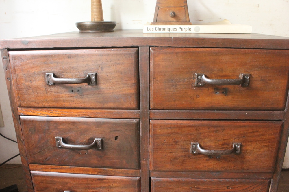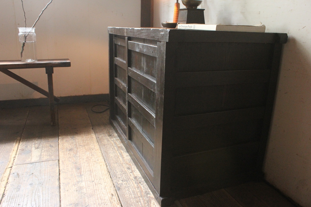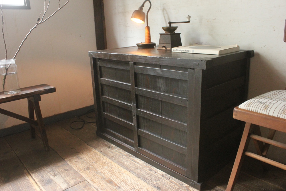 杉の収納棚です。明治頃のもので、とても味がある木です。何に使っていたんでしょうか?初めて見ます。扉の作りが変わっています。横幅が狭く、背が高く。深めの引き出しもついてちゃんと収納力もあります。見ているだけで楽しく幸せな気持ちになります。何、いれましょうね。