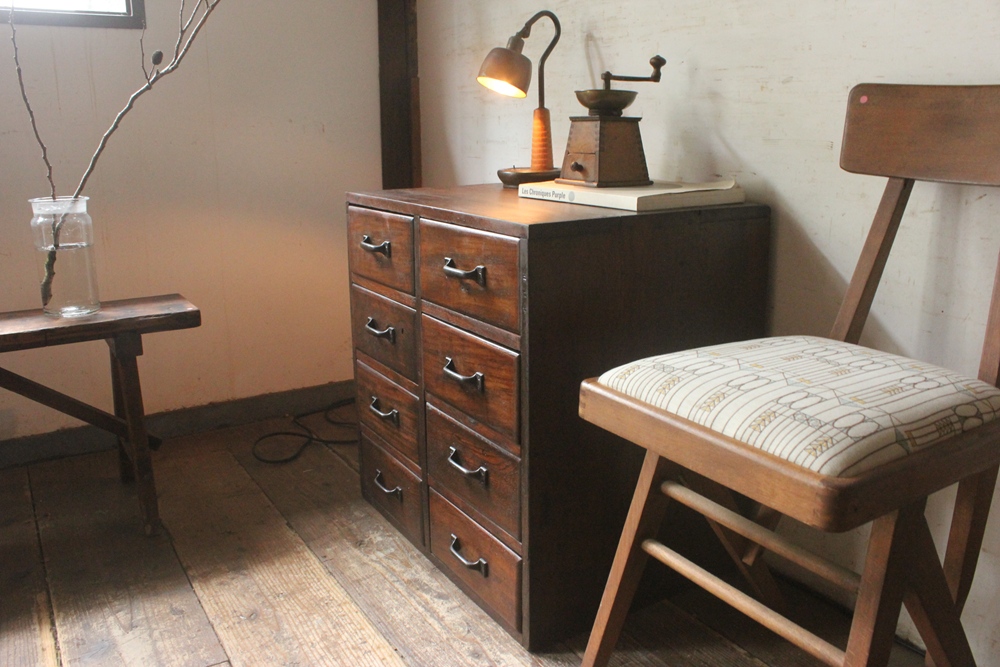 欅と杉のキャビネットです。前がケヤキ材でとても品のいいきれいな杢目です。片扉や細部の意匠までとても美しくなんとも言えません。明治から大正の和洋折衷なモダンであり、日本らしいデザインでもあり、どこで使われていたんでしょうね?お家だと、いっそ洋服などの収納などでも気軽に使ってもいいのでは。意外とすんなり収まる大きさです。